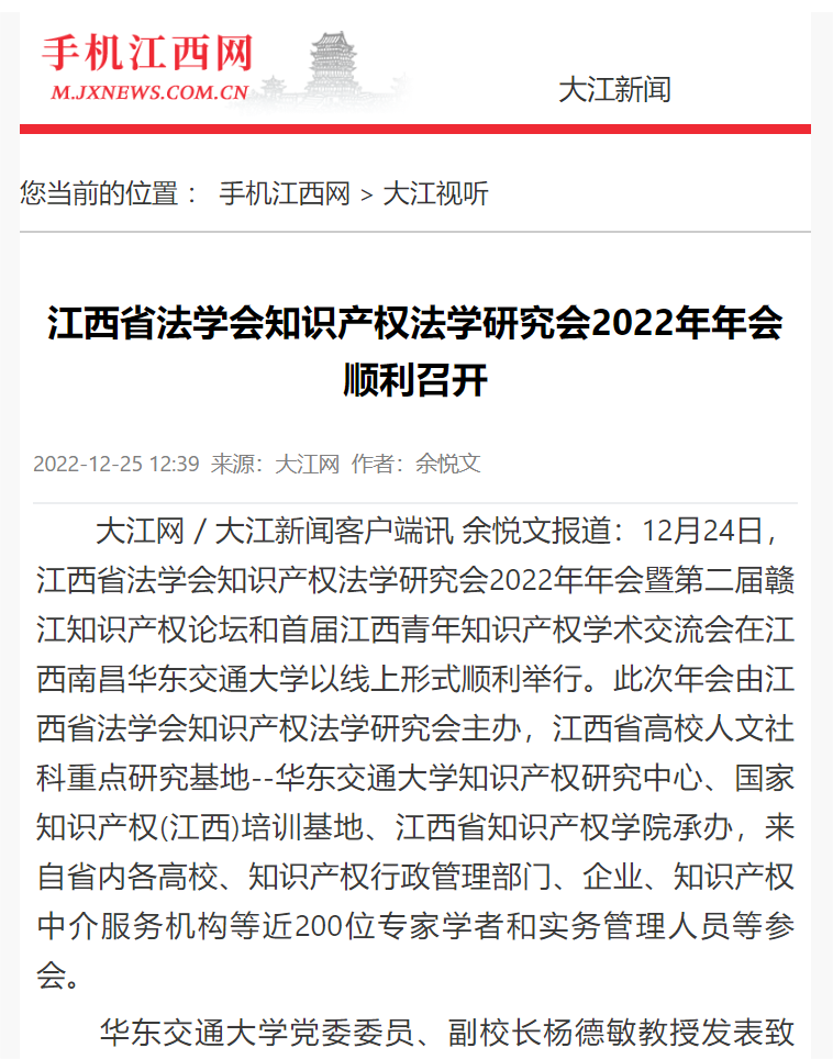 12月24日,江西省法学会知识产权法学研究会2022年年会暨第二届赣江知识产权论坛和首届江西青年知识产权学术交流会在江西南昌KY开元集团官网入口以线上形式顺利举行。此次年会由江西省法学会知识产权法学研究会主办,江西省高校人文社科重点研究基地--KY开元集团官网入口知识产权研究中心、国家知识产权(江西)培训基地、江西省知识产权学院承办,来自省内各高校、知识产权行政管理部门、企业、知识产权中介服务机构等近200位专家学者和实务管理人员等参会。