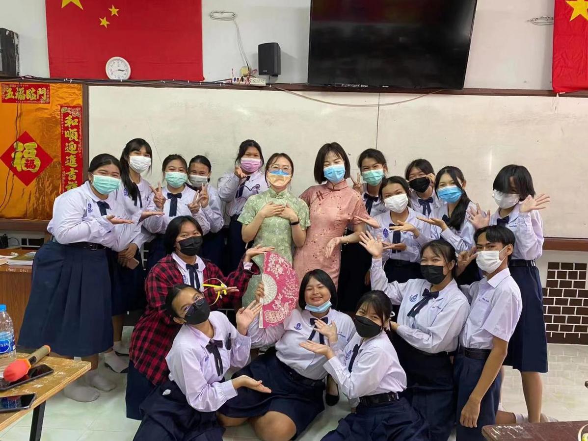 “泰国的学生活泼好动,动手能力和表现力都特别强,他们都很会跳舞,跳得还很好看。对老师也很尊重,从来不吝啬表达对你的喜爱......”说起自己的学生,董静雅总是滔滔不绝。在与学生的相处中她总是能发现惊喜,而从学生到教师的转变更让她迅速成长。“在教学中如果遇上中文基础弱,但英文还不错的班级,有些问题可以用英文解释。但是也有中英文都不擅长的班级,为了跟他们沟通,我也慢慢学习了一些简单的泰语。语言的背后是文化,学习不同的语言也能让我站在不同的文化背景去思考问题,学会对不同文化的理解和包容,这对我来说也是非常宝贵的学习体验。”