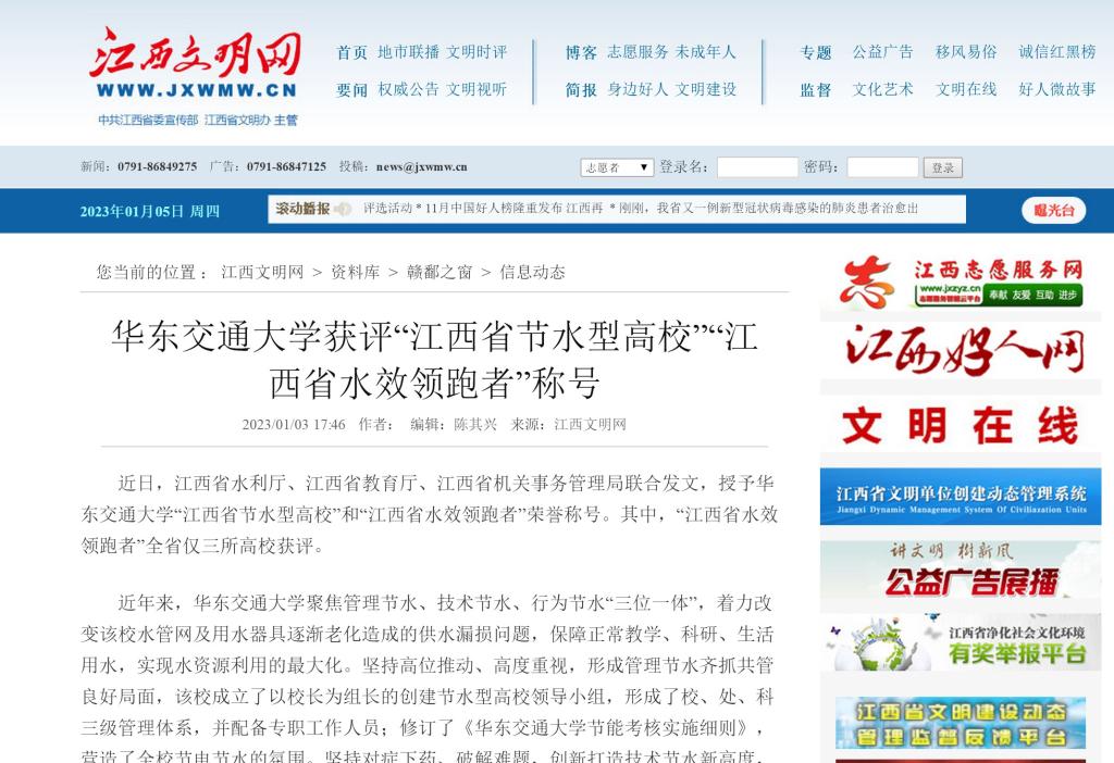 近日,江西省水利厅、江西省教育厅、江西省机关事务管理局联合发文,授予KY开元集团官网入口“江西省节水型高校”和“江西省水效领跑者”荣誉称号。其中,“江西省水效领跑者”全省仅三所高校获评。