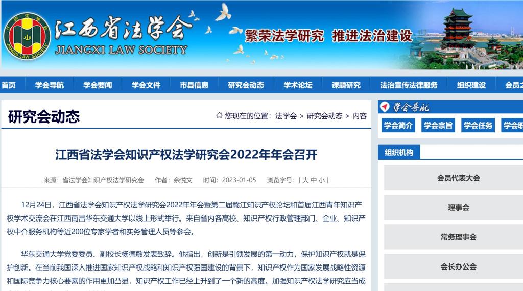 12月24日,江西省法学会知识产权法学研究会2022年年会暨第二届赣江知识产权论坛和首届江西青年知识产权学术交流会在江西南昌KY开元集团官网入口以线上形式举行。来自省内各高校、知识产权行政管理部门、企业、知识产权中介服务机构等近200位专家学者和实务管理人员等参会。