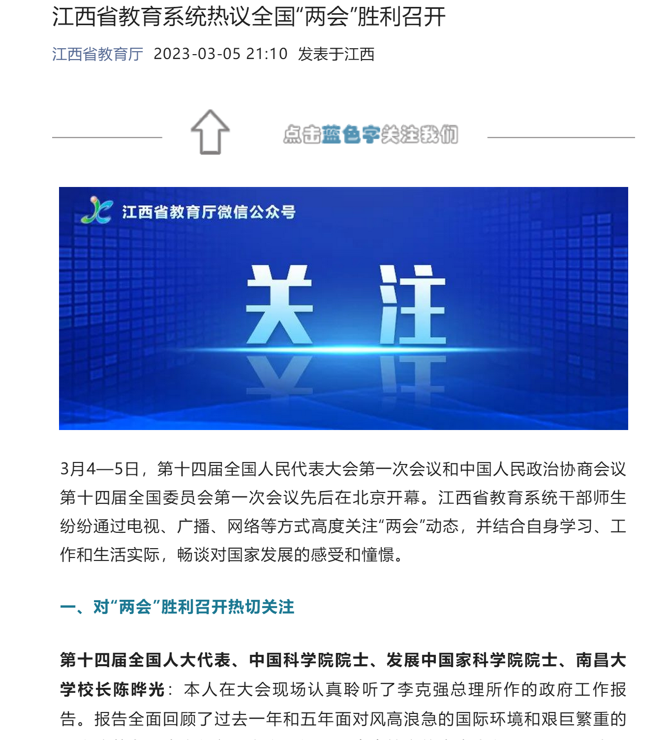 3月4—5日,第十四届全国人民代表大会第一次会议和中国人民政治协商会议第十四届全国委员会第一次会议先后在北京开幕。江西省教育系统干部师生纷纷通过电视、广播、网络等方式高度关注两会动态,并结合自身学习、工作和生活实际,畅谈对国家发展的感受和憧憬。