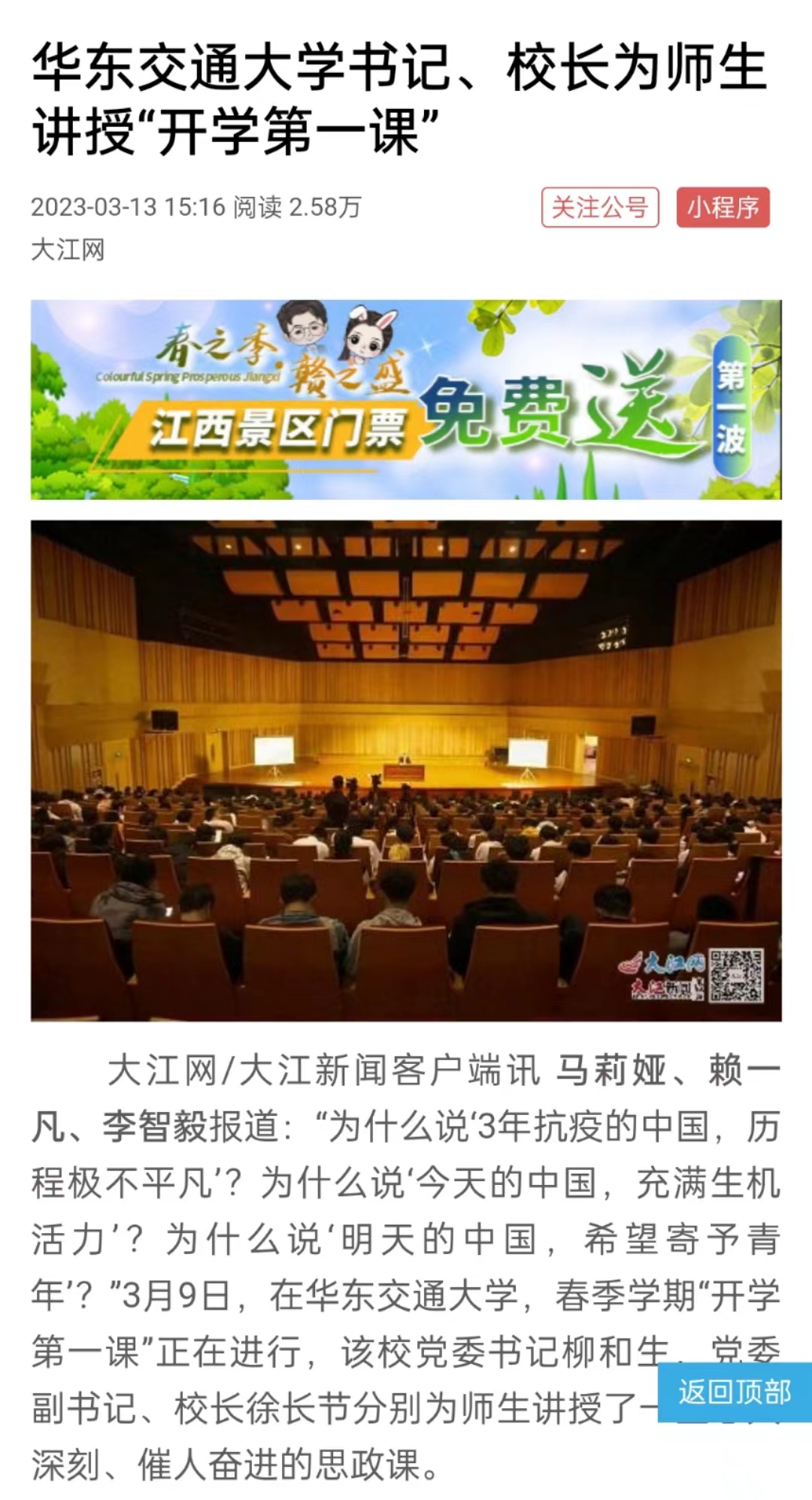 柳和生带领师生共同回顾了3年抗疫的艰辛历程和取得的伟大成果,并通过一系列鲜活的案例和翔实的数据,生动讲述了新时代十年以来国家、江西和学校取得的巨大成就。“要勇做‘铁心铸忠诚、铁血报家国、铁肩担使命、铁手创大业’的新时代铁人铁军,以积极向上的奋进心态、锐意进取的奋发状态、勇往直前的奋斗姿态,从春天出发,向着美好的未来奋跃而上,在中国式现代化的壮阔征程中扛起青春责任、彰显青春担当,展现青春力量、谱写青春华章。”柳和生寄语青年师生。