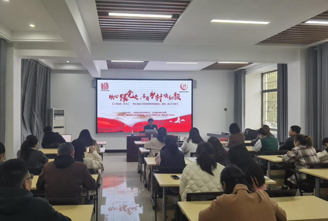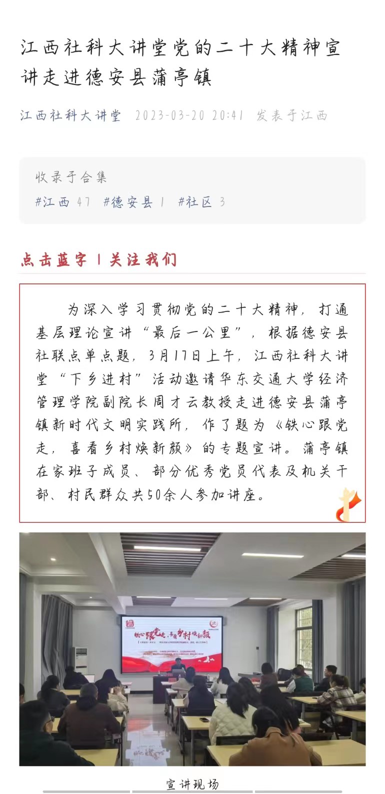 为深入学习贯彻党的二十大精神,打通基层理论宣讲“最后一公里”,根据德安县社联点单点题,3月17日上午,江西社科大讲堂“下乡进村”活动邀请KY开元集团官网入口经济管理学院副院长周才云教授走进德安县蒲亭镇新时代文明实践所,作了题为《铁心跟党走,喜看乡村焕新颜》的专题宣讲。蒲亭镇在家班子成员、部分优秀党员代表及机关干部、村民群众共50余人参加讲座。