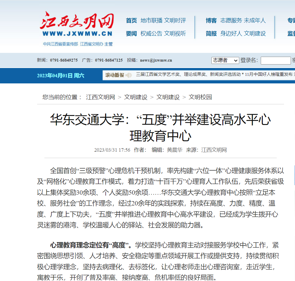 心理服务社会有“广度”。充分发挥学校心理教育中心和心理素质教育研究院与挂靠学校的两个省中心(江西省青少年心理健康教育辅导中心、江西省高校心理素质拓展和实训中心)、一个联盟(江西省大中小学心理健康教育一体化联盟)、一个督导点(中国心理学会注册系统江西督导项目点)、一个科普基地(江西省社会科学普及基地)的平台优势,积极协助有关部门开展调研、培训、督导、比赛、科普等,尤其去年和今年协助省教育厅为20万名中小学幼儿园班主任开展心理培训,着力推进学校心理教育工作关口前移,同时注重加强与媒体的联系合作,扩展辐射影响。在社会服务过程中,不断锤炼专业团队,拓展工作视野,营造了良好的社会氛围,反哺促进了学校心理健康教育工作。