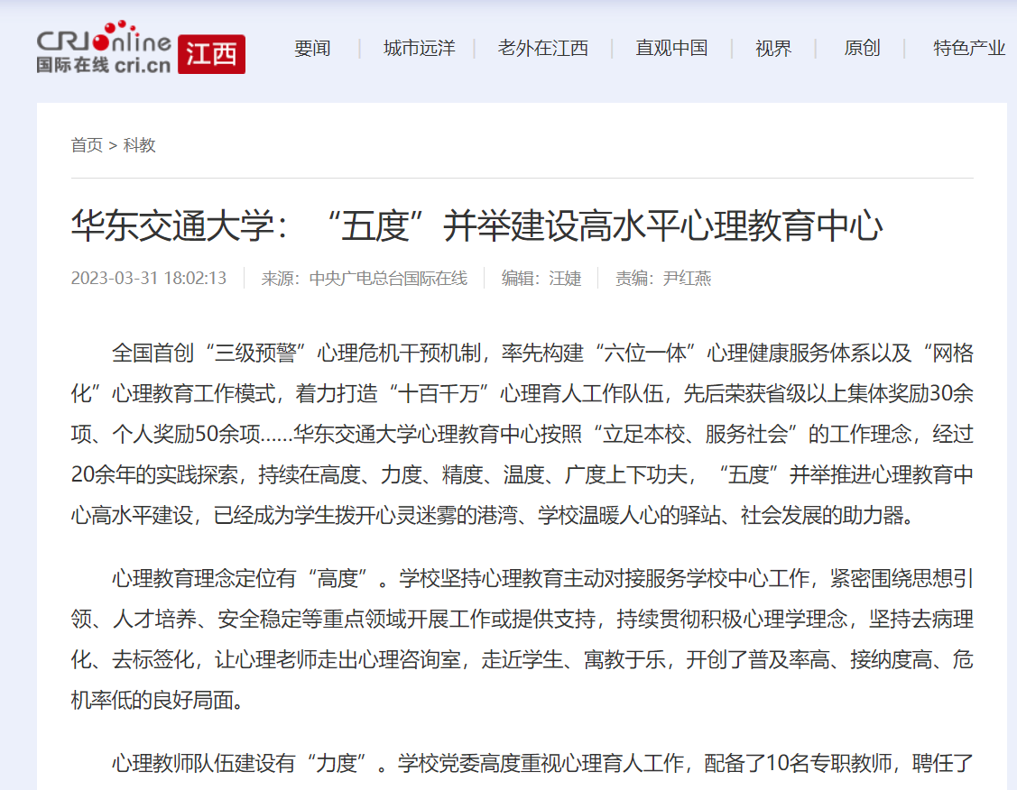 心理服务社会有“广度”。充分发挥学校心理教育中心和心理素质教育研究院与挂靠学校的两个省中心(江西省青少年心理健康教育辅导中心、江西省高校心理素质拓展和实训中心)、一个联盟(江西省大中小学心理健康教育一体化联盟)、一个督导点(中国心理学会注册系统江西督导项目点)、一个科普基地(江西省社会科学普及基地)的平台优势,积极协助有关部门开展调研、培训、督导、比赛、科普等,尤其2022年和2023年协助省教育厅为20万名中小学幼儿园班主任开展心理培训,着力推进学校心理教育工作关口前移,同时注重加强与媒体的联系合作,扩展辐射影响。在社会服务过程中,不断锤炼专业团队,拓展工作视野,营造了良好的社会氛围,反哺促进了学校心理健康教育工作。
