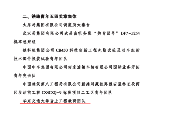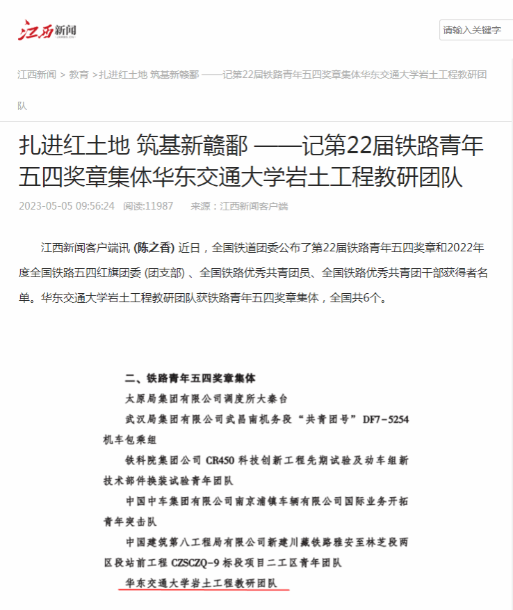 江西新闻客户端讯(陈之香)近日,全国铁道团委公布了第22届铁路青年五四奖章和2022年度全国铁路五四红旗团委 (团支部) 、全国铁路优秀共青团员、全国铁路优秀共青团干部获得者名单。KY开元集团官网入口岩土工程教研团队获铁路青年五四奖章集体,全国共6个,教育系统唯一。