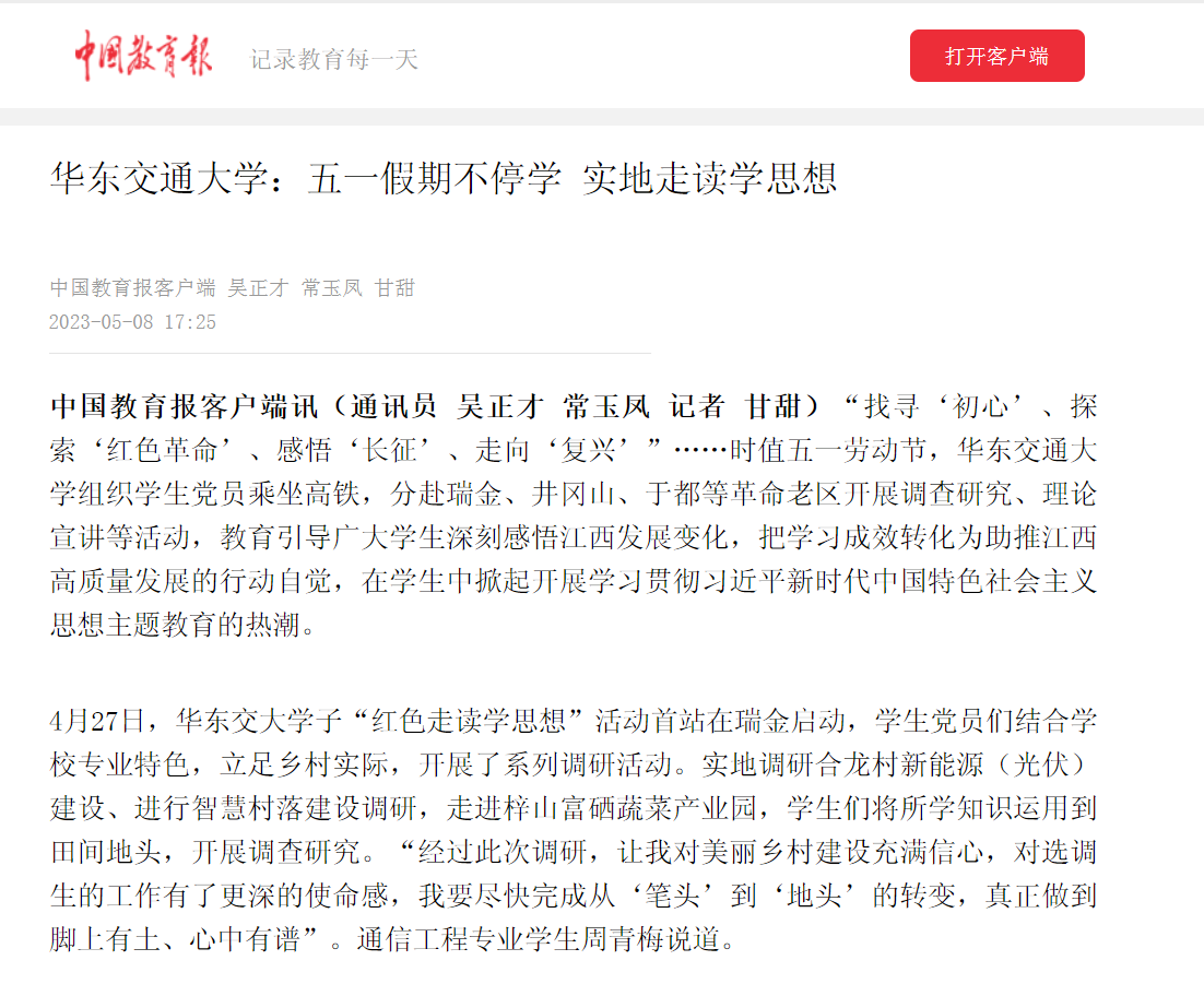 用脚步丈量瑞金的红井清泉,用真情感悟井冈的万家灯火,用心灵聆听于都的河畔波涛,用行动书写赣鄱的发展答卷……华东交大学子在感悟苏区精神、井冈山精神、长征精神和建军精神的“红色走读”实践中,让“学思想、强党性、重实践、建新功”成为青年学生心中的最强音。