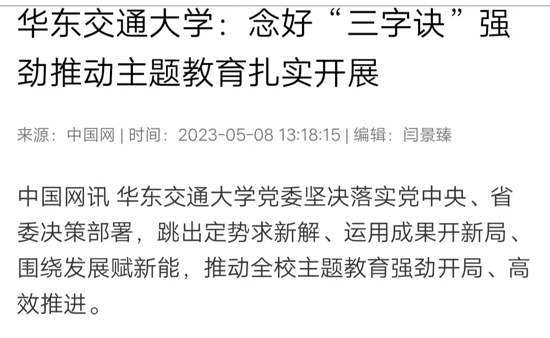 “融”字贯穿,学干结合。学校党委将开展主题教育同推动高质量发展有机结合起来,将理论学习同实践运用有机结合起来,及时制定《主题教育调查研究工作方案》,形成“全校一盘棋、调研开新局”的“路线图”和“时间表”。精准对标。围绕贯彻执行党的理论和路线方针政策、党中央重大决策部署,广泛覆盖、精准聚焦学校改革发展过程中存在的突出问题和师生员工关注的热点难点问题,明确了12个事关全局的重点调研方向。精细对表。聚焦学校发展所需、改革所急、基层所盼、师生所想,校党委班子每名成员带头做到身入心入,结合工作实际分别牵头领题,确定“以高质量党建引领一流学科建设”“高层次人才服务江西交通行业高质量发展”等14个专项调研主题,内容涵盖党建、人才、干部、就业、教育教学、学科科研、政治监督等各个领域。处级干部立足本职确定个人选题,做到重点突出、各有侧重、题岗相适,形成全校“14+N”个调研主题。精心对位。坚持把理论学习、调查研究、推动发展、检视整改、建章立制贯通起来,严格按照调研计划序时推进,推动形成务实管用的思路办法和破解之策,确保调查研究聚焦真问题、取得真实效。该校武装保卫党支部以校园交通安全治理为切入点开展调研,提出在着力化解师生交通安全隐患、优化校园交通环境、预防交通安全事故三方面下功夫。轨道中心直属党支部聚焦国家重点实验室建设,在关键核心技术创新、激发团队活力等方面迅速领题调研,助推铁路行业和江西地方产业高质量发展。