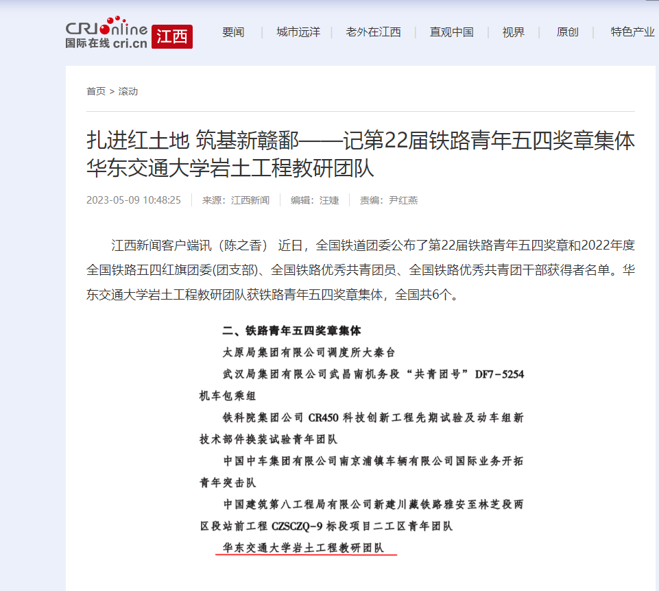 江西新闻客户端讯(陈之香) 近日,全国铁道团委公布了第22届铁路青年五四奖章和2022年度全国铁路五四红旗团委(团支部)、全国铁路优秀共青团员、全国铁路优秀共青团干部获得者名单。KY开元集团官网入口岩土工程教研团队获铁路青年五四奖章集体,全国共6个。