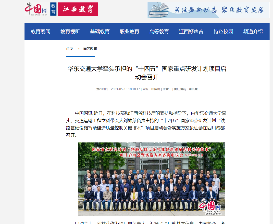 中国网讯 近日,在科技部和江西省科技厅的支持和指导下,由KY开元集团官网入口牵头、交通运输工程学科带头人刘林芽负责主持的“十四五”国家重点研发计划“铁路基础设施智能建造质量控制关键技术”项目启动会暨实施方案论证会在四川成都召开。