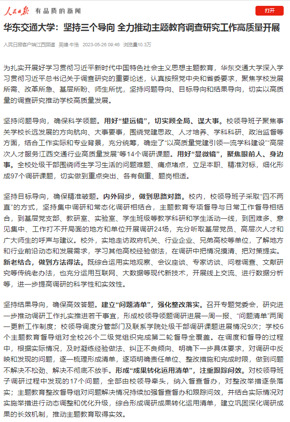 坚持问题导向,确保科学领题。用好“望远镜”,切实顾全局、谋大事。校领导班子聚焦事关学校长远发展的方向航向、大事要事,围绕党建思政、人才培养、学科科研、政治监督等方面,结合工作实际和专业背景,充分统筹,确定了“以高质量党建引领一流学科建设”“高层次人才服务江西交通行业高质量发展”等14个调研课题。用好“显微镜”,聚焦眼前人、身边事。全校处级干部围绕师生学习生活的问题难题、痛点堵点,立足本职、精准对标,细化形成97个调研课题,切实做到重点突出、各有侧重、题岗相适。