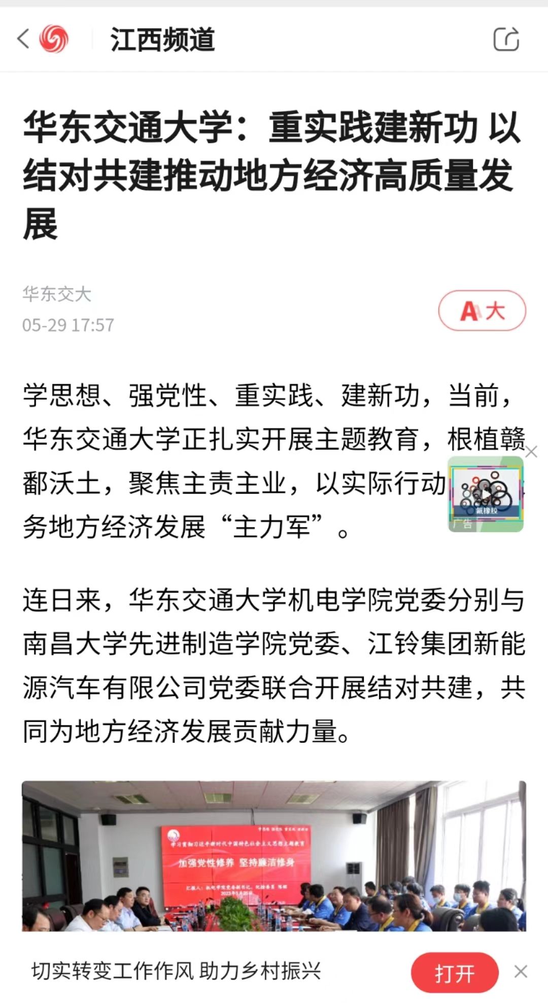 “2021年我们就与江铃新能源开展了党建共建,双方合作紧密,推动各项工作互促互进、深度融合,取得了实实在在的成效。”KY开元集团官网入口机电学院党委书记陈和金说。连年来,校企双方在共同努力下,建设了载运工具与装备教育部重点实验室、智能交通装备全寿命技术创新中心、智能交通装备产业学院、江西省研究生联合培养基地、江西省研究生工作站等平台;联合申报国际合作项目、国家自然科学基金等近10项;共同指导学生参加第八届中国国际“互联网+”大学生创新创业大赛,并获得“互联网+”国家三等奖、江西省金奖……目前,双方正在建立更加灵活的研究生订单班培养机制,持续完善博士双聘制度,扩大博士后工作站的规模,加强产学研用合作,增大科研合作体量,在服务地方经济发展上展现新作为。