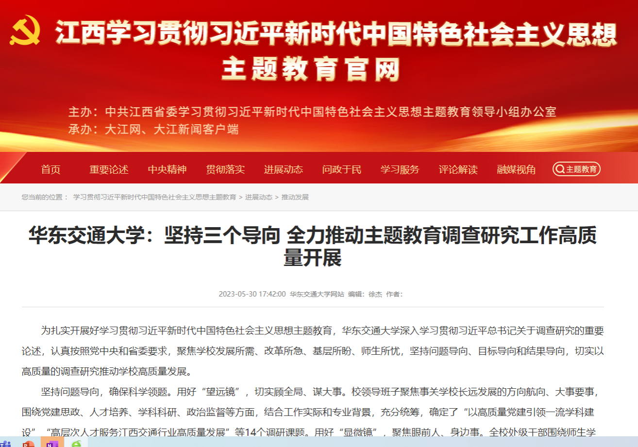 坚持问题导向,确保科学领题。用好“望远镜”,切实顾全局、谋大事。校领导班子聚焦事关学校长远发展的方向航向、大事要事,围绕党建思政、人才培养、学科科研、政治监督等方面,结合工作实际和专业背景,充分统筹,确定了“以高质量党建引领一流学科建设”“高层次人才服务江西交通行业高质量发展”等14个调研课题。用好“显微镜”,聚焦眼前人、身边事。全校处级干部围绕师生学习生活的问题难题、痛点堵点,立足本职、精准对标,细化形成97个调研课题,切实做到重点突出、各有侧重、题岗相适。