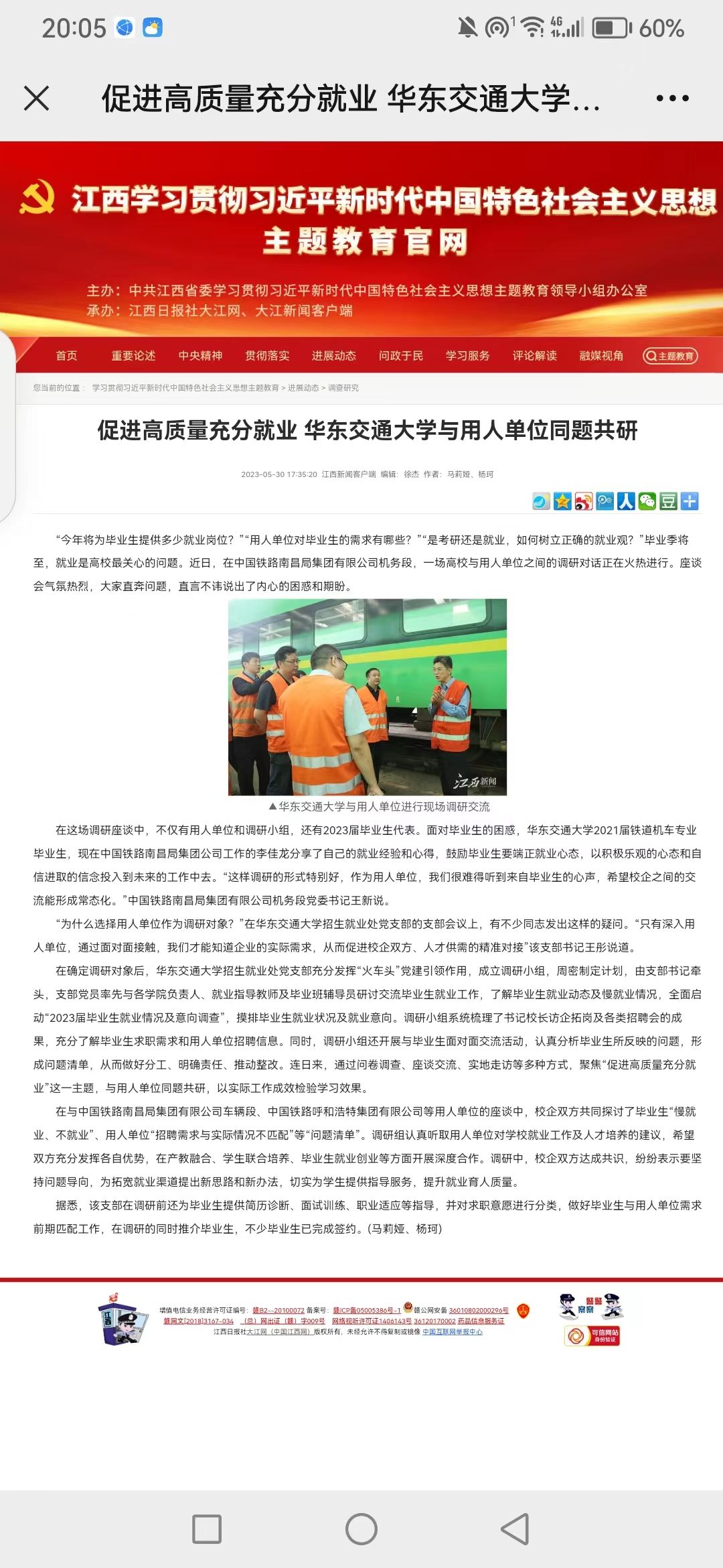 在与中国铁路南昌局集团有限公司车辆段、中国铁路呼和浩特集团有限公司等用人单位的座谈中,校企双方共同探讨了毕业生“慢就业、不就业”、用人单位“招聘需求与实际情况不匹配”等“问题清单”。调研组认真听取用人单位对学校就业工作及人才培养的建议,希望双方充分发挥各自优势,在产教融合、学生联合培养、毕业生就业创业等方面开展深度合作。调研中,校企双方达成共识,纷纷表示要坚持问题导向,为拓宽就业渠道提出新思路和新办法,切实为学生提供指导服务,提升就业育人质量。