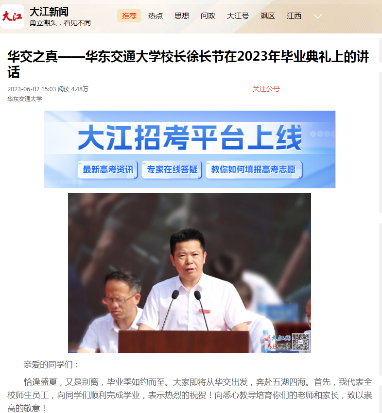 恰逢盛夏,又是别离,毕业季如约而至。大家即将从华交出发,奔赴五湖四海。首先,我代表全校师生员工,向同学们顺利完成学业,表示热烈的祝贺!向悉心教导培育你们的老师和家长,致以崇高的敬意!