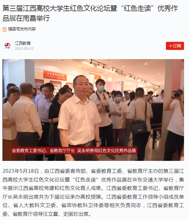 2023年5月18日,由江西省委宣传部、省委教育工委、省教育厅主办的第三届江西高校大学生红色文化论坛暨“红色走读”优秀作品展在KY开元集团官网入口举行,集中展示江西省高校党建和红色文化育人成果。江西省委教育工委书记、省教育厅厅长吴永明出席并为下届论坛承办高校授旗。江西省委教育工作领导小组成员单位、省人大教科文卫委、省政协教科卫体委等相关负责同志,江西省委教育工委、省教育厅领导汪立夏、史国珍出席。