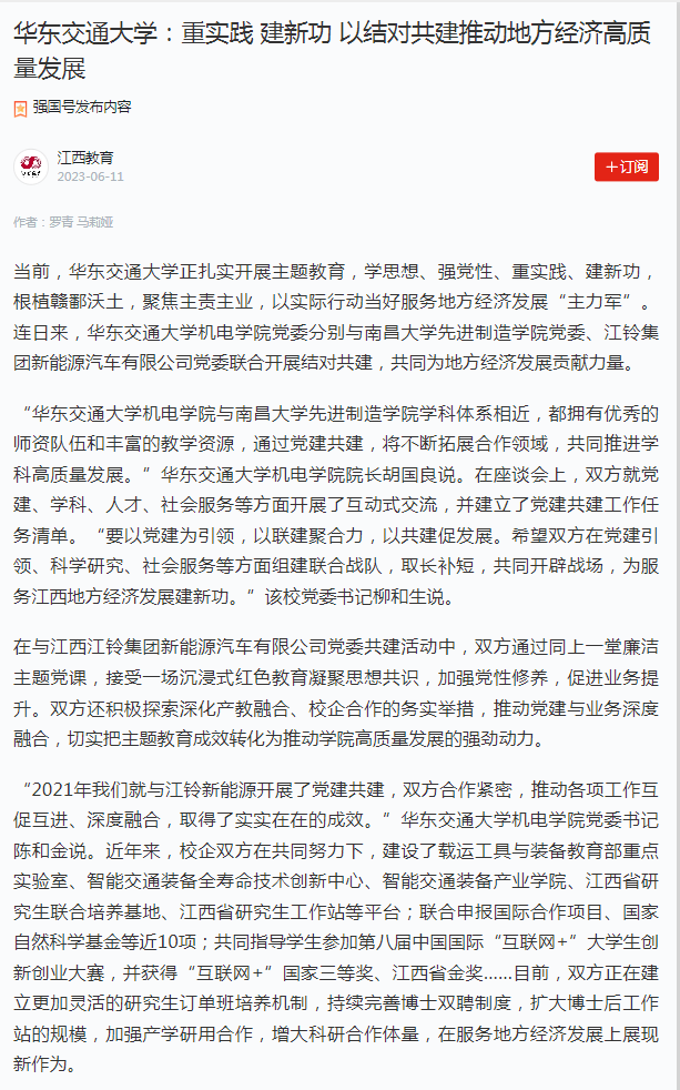 “2021年我们就与江铃新能源开展了党建共建,双方合作紧密,推动各项工作互促互进、深度融合,取得了实实在在的成效。”KY开元集团官网入口机电学院党委书记陈和金说。近年来,校企双方在共同努力下,建设了载运工具与装备教育部重点实验室、智能交通装备全寿命技术创新中心、智能交通装备产业学院、江西省研究生联合培养基地、江西省研究生工作站等平台;联合申报国际合作项目、国家自然科学基金等近10项;共同指导学生参加第八届中国国际“互联网+”大学生创新创业大赛,并获得“互联网+”国家三等奖、江西省金奖……目前,双方正在建立更加灵活的研究生订单班培养机制,持续完善博士双聘制度,扩大博士后工作站的规模,加强产学研用合作,增大科研合作体量,在服务地方经济发展上展现新作为。
