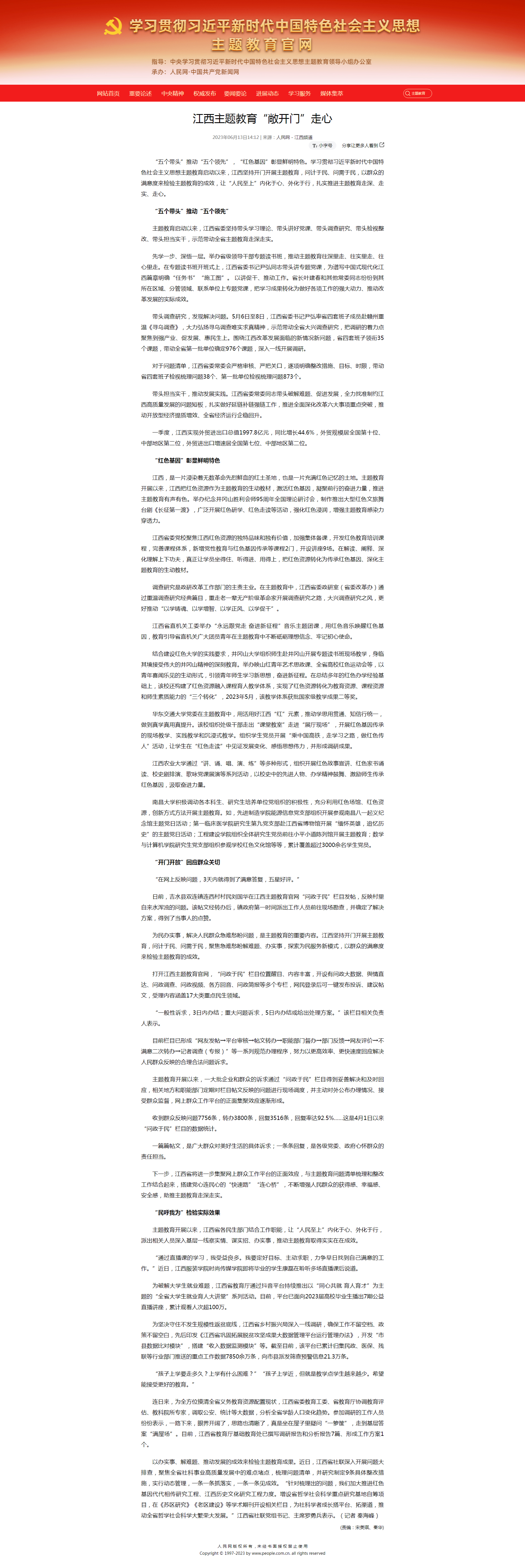 “五个带头”推动“五个领先”,“红色基因”彰显鲜明特色。学习贯彻习近平新时代中国特色社会主义思想主题教育启动以来,江西坚持开门开展主题教育,问计于民、问需于民,以群众的满意度来检验主题教育的成效,让“人民至上”内化于心、外化于行,扎实推进主题教育走深、走实、走心。