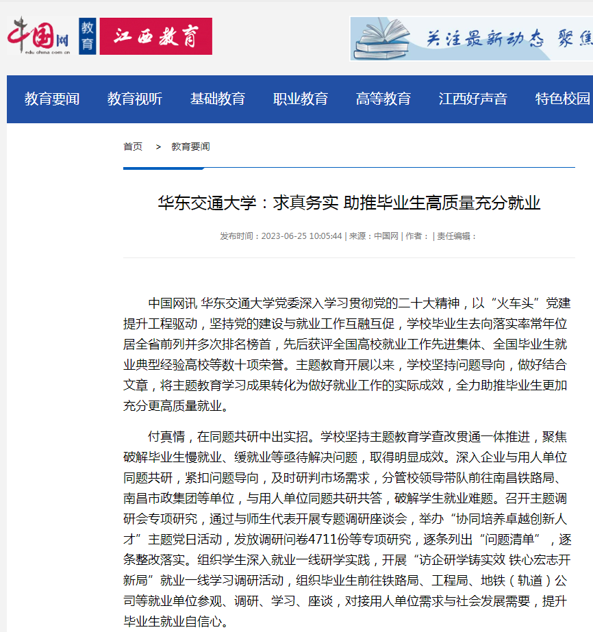 就业是最大的民生。主题教育开展以来,学校进一步完善了提高效率、促进发展的就业工作举措,推动了一批服务学生就业能力提升的对策与行动。下一步,华东交大将继续推进主题教育与就业工作同频共振、一体推进,全力推动毕业生高质量充分就业。