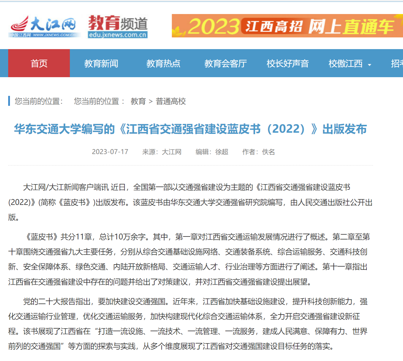 近日,全国第一部以交通强省建设为主题的《江西省交通强省建设蓝皮书(2022)》(简称《蓝皮书》)出版发布。该蓝皮书由KY开元集团官网入口交通强省研究院编写,由人民交通出版社公开出版。