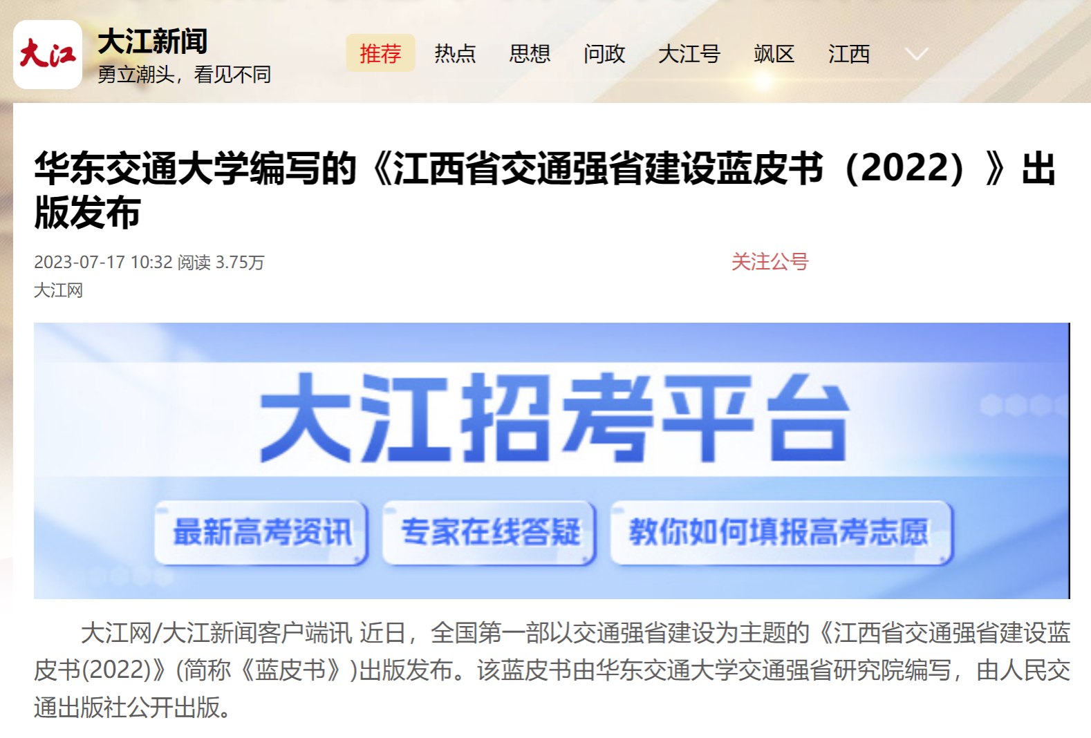 近日,全国第一部以交通强省建设为主题的《江西省交通强省建设蓝皮书(2022)》(简称《蓝皮书》)出版发布。该蓝皮书由KY开元集团官网入口交通强省研究院编写,由人民交通出版社公开出版。