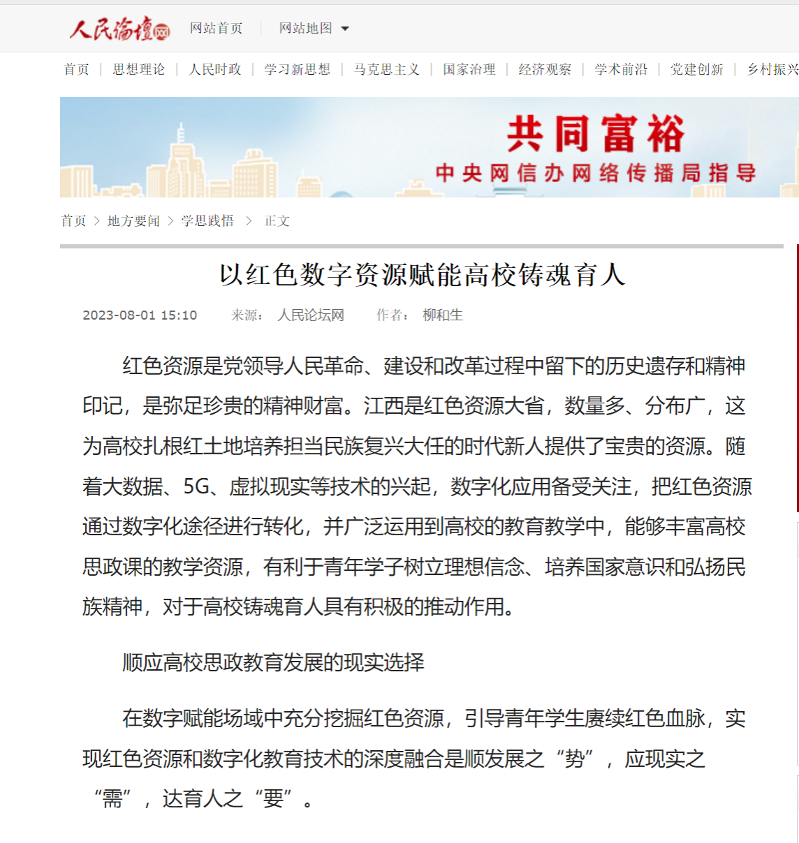 红色资源是党领导人民革命、建设和改革过程中留下的历史遗存和精神印记,是弥足珍贵的精神财富。江西是红色资源大省,数量多、分布广,这为高校扎根红土地培养担当民族复兴大任的时代新人提供了宝贵的资源。随着大数据、5G、虚拟现实等技术的兴起,数字化应用备受关注,把红色资源通过数字化途径进行转化,并广泛运用到高校的教育教学中,能够丰富高校思政课的教学资源,有利于青年学子树立理想信念、培养国家意识和弘扬民族精神,对于高校铸魂育人具有积极的推动作用。