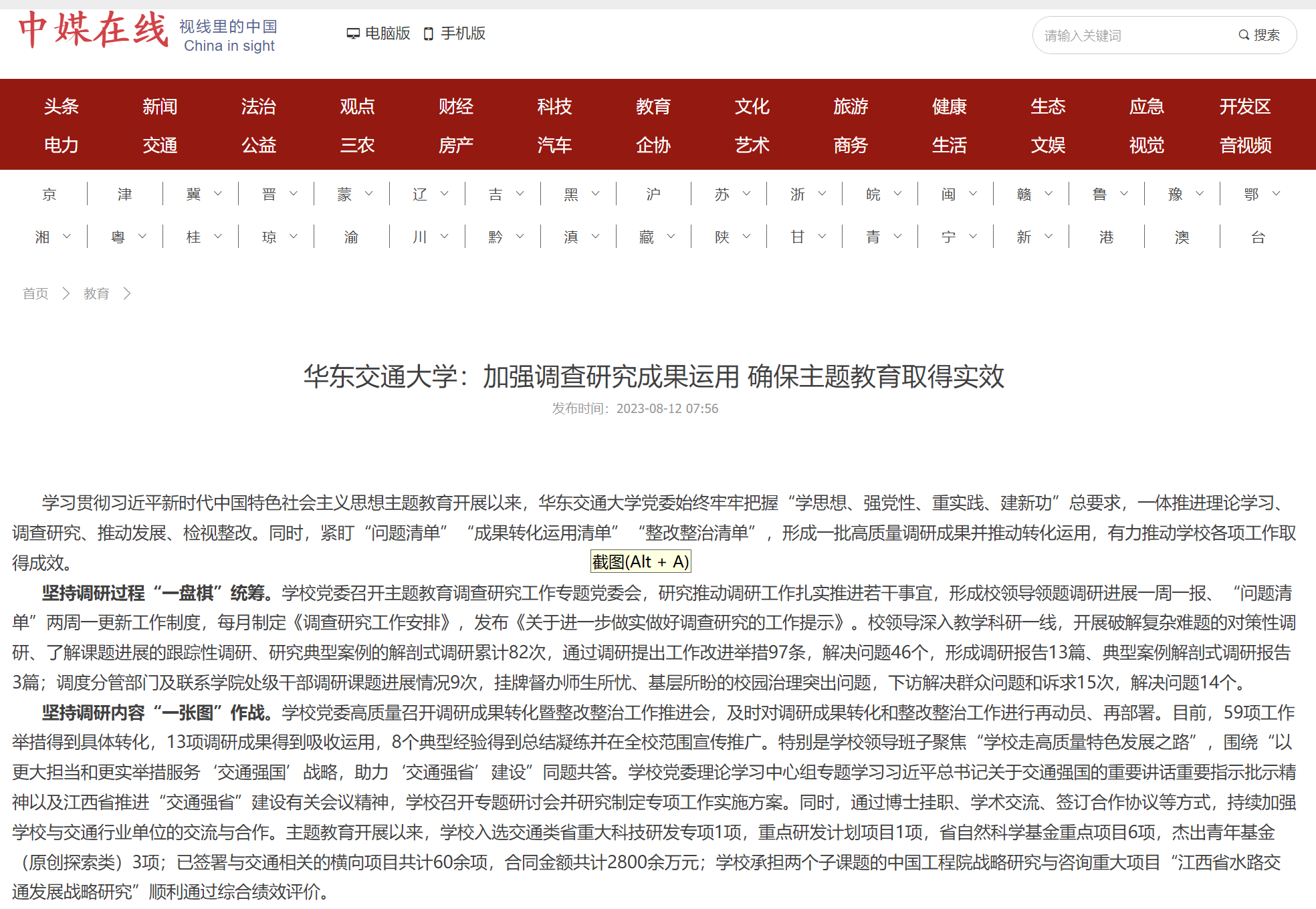 坚持调研内容“一张图”作战。学校党委高质量召开调研成果转化暨整改整治工作推进会,及时对调研成果转化和整改整治工作进行再动员、再部署。目前,59项工作举措得到具体转化,13项调研成果得到吸收运用,8个典型经验得到总结凝练并在全校范围宣传推广。特别是学校领导班子聚焦“学校走高质量特色发展之路”,围绕“以更大担当和更实举措服务‘交通强国’战略,助力‘交通强省’建设”同题共答。学校党委理论学习中心组专题学习习近平总书记关于交通强国的重要讲话重要指示批示精神以及江西省推进“交通强省”建设有关会议精神,学校召开专题研讨会并研究制定专项工作实施方案。同时,通过博士挂职、学术交流、签订合作协议等方式,持续加强学校与交通行业单位的交流与合作。主题教育开展以来,学校入选交通类省重大科技研发专项1项,重点研发计划项目1项,省自然科学基金重点项目6项,杰出青年基金(原创探索类)3项;已签署与交通相关的横向项目共计60余项,合同金额共计2800余万元;学校承担两个子课题的中国工程院战略研究与咨询重大项目“江西省水路交通发展战略研究”顺利通过综合绩效评价。
