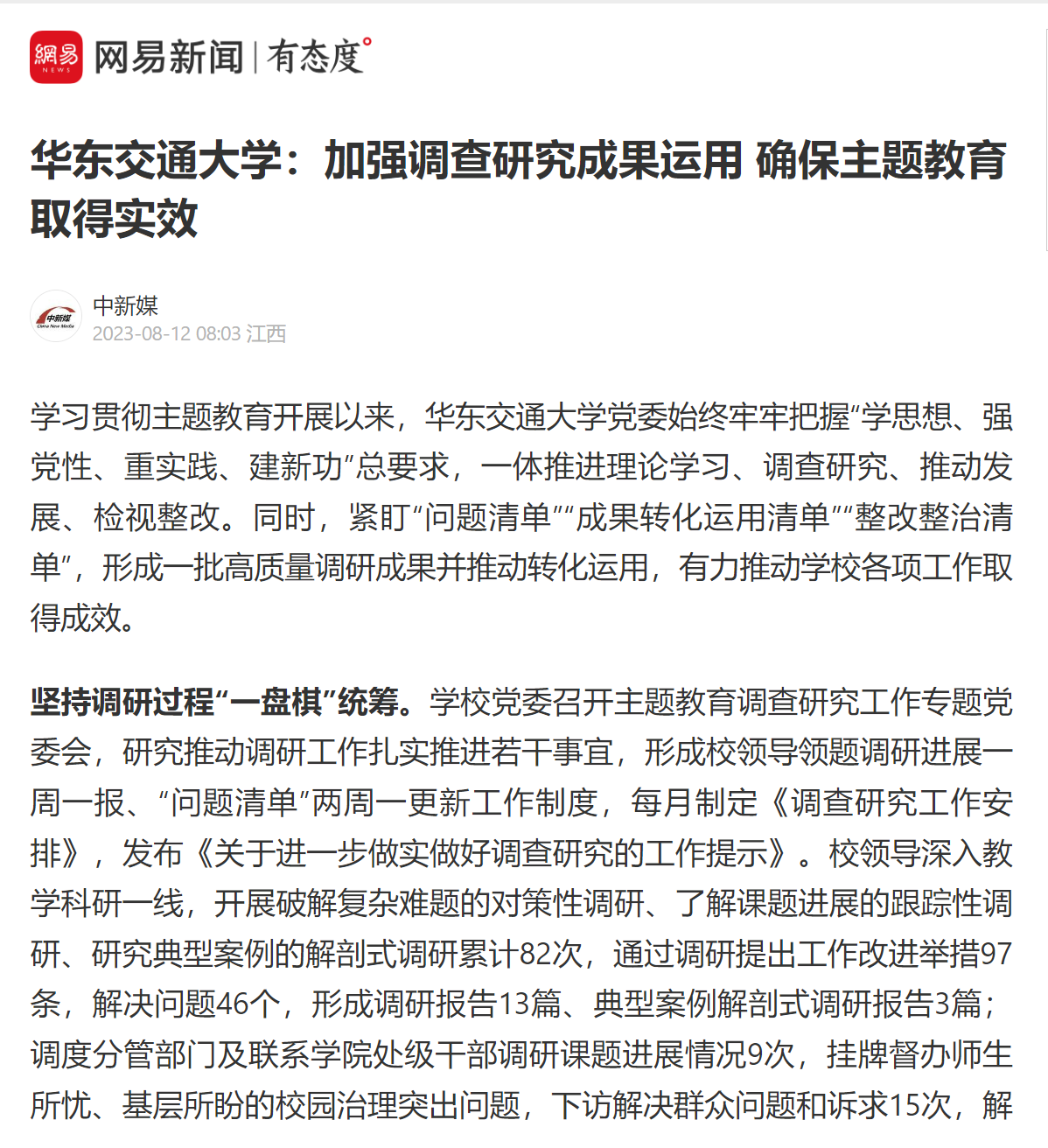 坚持调研内容“一张图”作战。学校党委高质量召开调研成果转化暨整改整治工作推进会,及时对调研成果转化和整改整治工作进行再动员、再部署。目前,59项工作举措得到具体转化,13项调研成果得到吸收运用,8个典型经验得到总结凝练并在全校范围宣传推广。特别是学校领导班子聚焦“学校走高质量特色发展之路”,围绕“以更大担当和更实举措服务‘交通强国’战略,助力‘交通强省’建设”同题共答。学校党委理论学习中心组专题学习关于交通强国的重要讲话重要指示批示精神以及江西省推进“交通强省”建设有关会议精神,学校召开专题研讨会并研究制定专项工作实施方案。同时,通过博士挂职、学术交流、签订合作协议等方式,持续加强学校与交通行业单位的交流与合作。主题教育开展以来,学校入选交通类省重大科技研发专项1项,重点研发计划项目1项,省自然科学基金重点项目6项,杰出青年基金(原创探索类)3项;已签署与交通相关的横向项目共计60余项,合同金额共计2800余万元;学校承担两个子课题的中国工程院战略研究与咨询重大项目“江西省水路交通发展战略研究”顺利通过综合绩效评价。