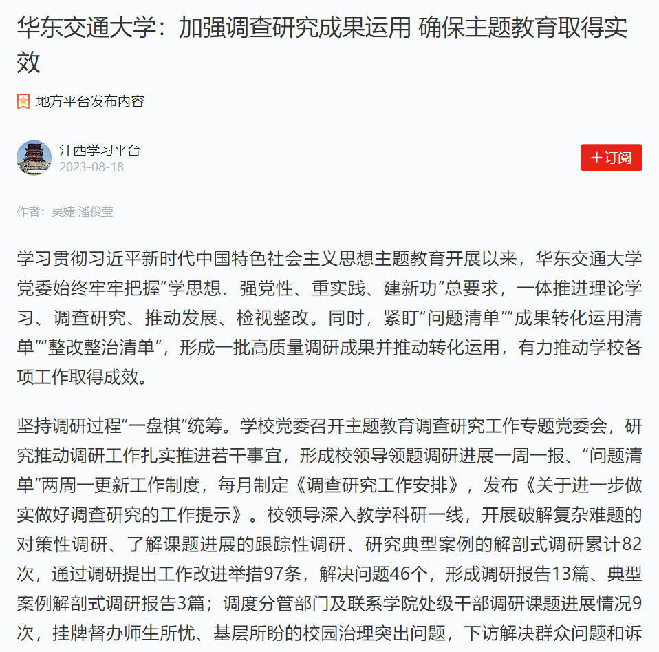 坚持调研内容“一张图”作战。学校党委高质量召开调研成果转化暨整改整治工作推进会,及时对调研成果转化和整改整治工作进行再动员、再部署。目前,59项工作举措得到具体转化,13项调研成果得到吸收运用,8个典型经验得到总结凝练并在全校范围宣传推广。特别是学校领导班子聚焦“学校走高质量特色发展之路”,围绕“以更大担当和更实举措服务‘交通强国’战略,助力‘交通强省’建设”同题共答。学校党委理论学习中心组专题学习习近平总书记关于交通强国的重要讲话重要指示批示精神以及江西省推进“交通强省”建设有关会议精神,学校召开专题研讨会并研究制定专项工作实施方案。同时,通过博士挂职、学术交流、签订合作协议等方式,持续加强学校与交通行业单位的交流与合作。主题教育开展以来,学校入选交通类省重大科技研发专项1项,重点研发计划项目1项,省自然科学基金重点项目6项,杰出青年基金(原创探索类)3项;已签署与交通相关的横向项目共计60余项,合同金额共计2800余万元;学校承担两个子课题的中国工程院战略研究与咨询重大项目“江西省水路交通发展战略研究”顺利通过综合绩效评价。