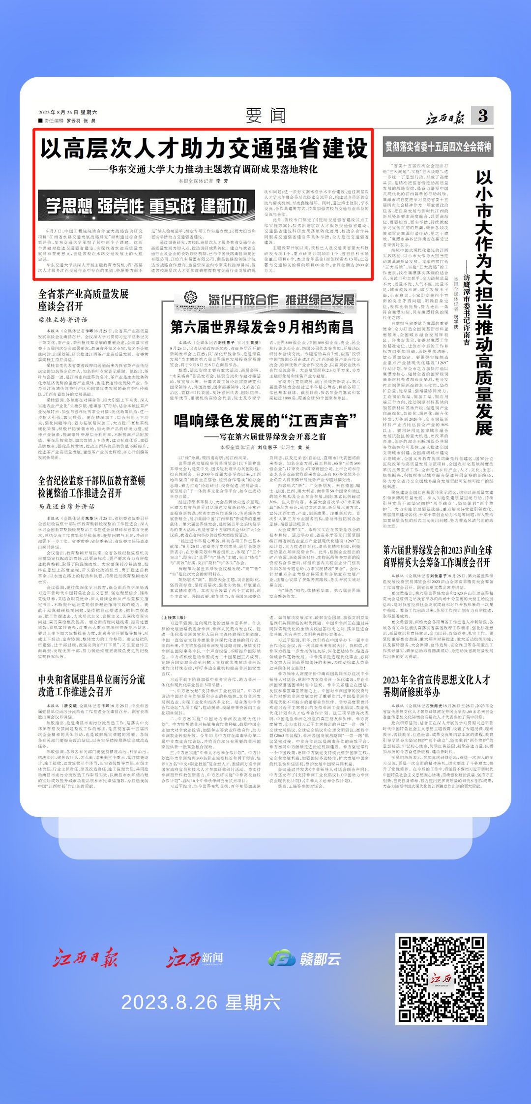 通过调查研究,该校以高层次人才服务我省交通行业高质量发展为切入点,推动调研成果转化。建立与我省交通行业及企业的长效联络机制,已与中国铁路南昌局集团有限公司、江铃汽车集团有限公司、南昌铁路勘测设计院达成战略合作意向;邀请资深业内专家来校指导讲座,促进该校高层次人才更加准确把握我省交通行业发展的现状和问题;进一步夯实高水准学术平台建设,通过高层次人才学术午餐会等形式搭建交流平台,构建以老带新的交流与帮扶机制,形成良性循环。同时,通过博士挂职、学术交流、合作共建等方式,持续加强该校与交通行业单位的交流与合作。