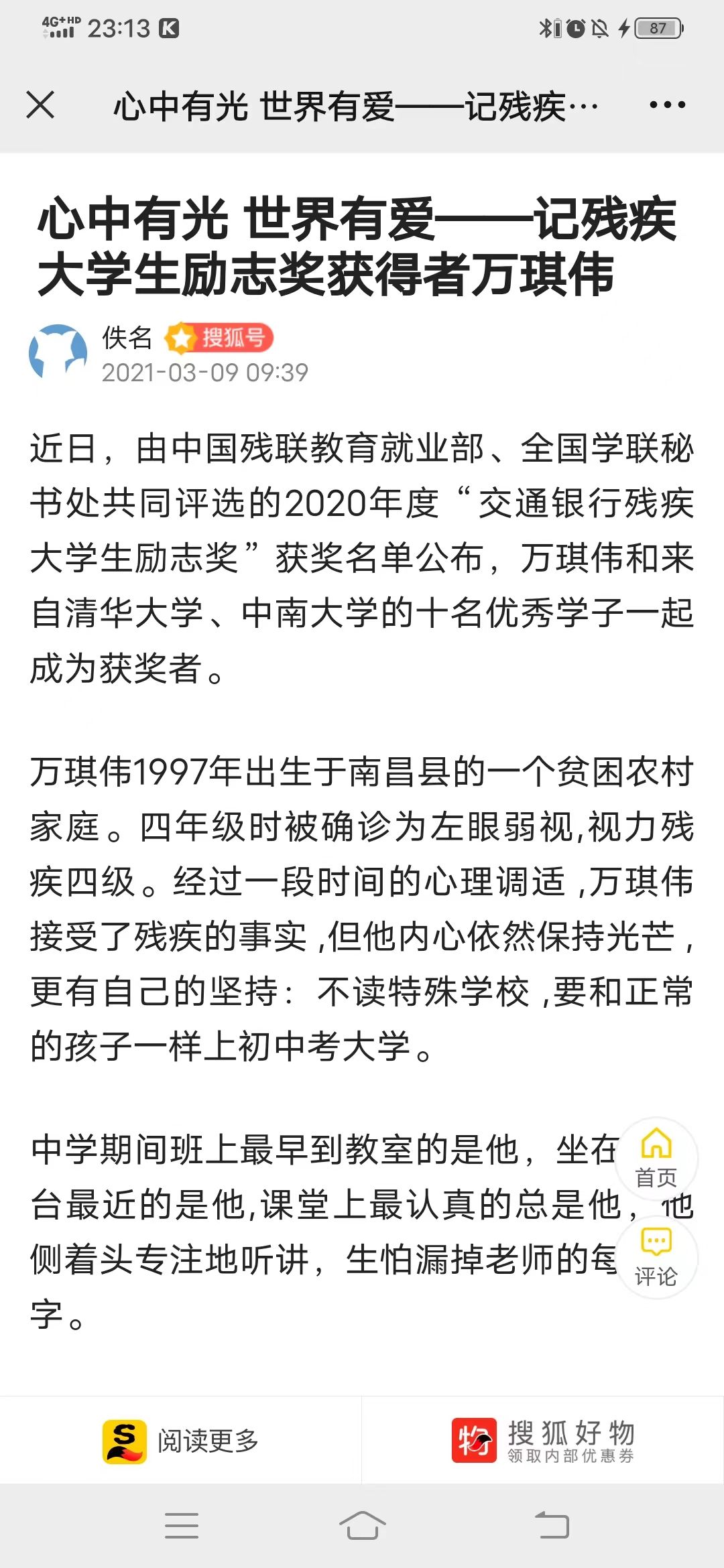 近日,由中国残联教育就业部、全国学联秘书处共同评选的2020年度“交通银行残疾大学生励志奖”获奖名单公布,万琪伟和来自清华大学、中南大学的十名优秀学子一起成为获奖者。