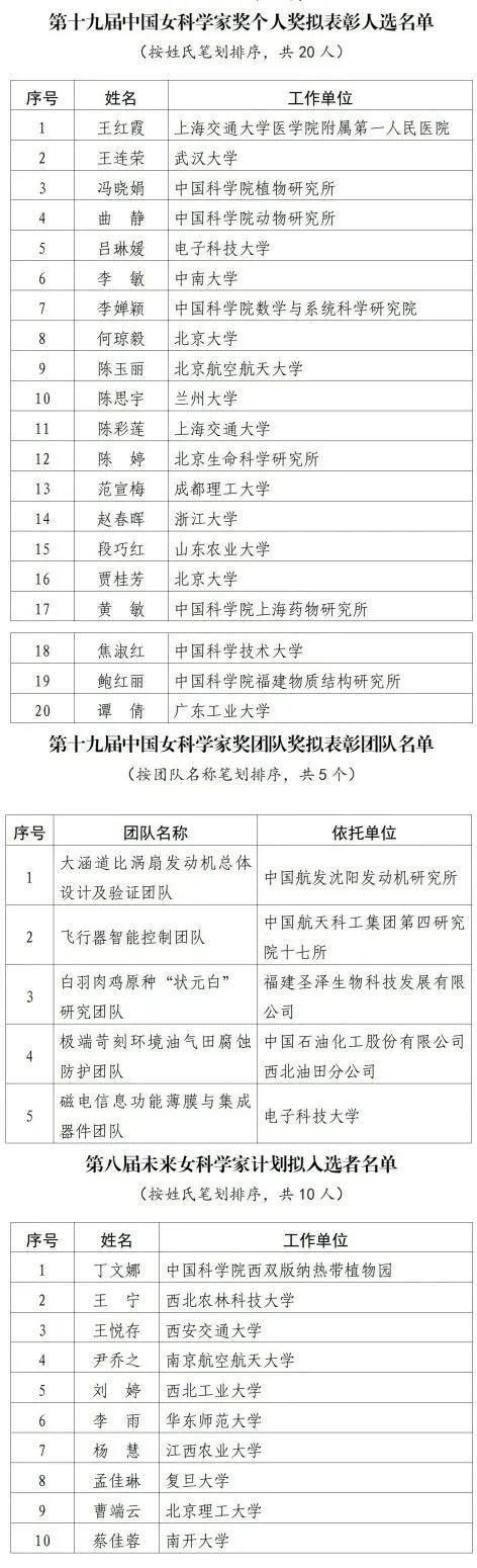 【科奖中心公众号】重磅!第十九届中国青年女科学家奖拟表彰对象和第八届未来女科学家计划拟入选者公布