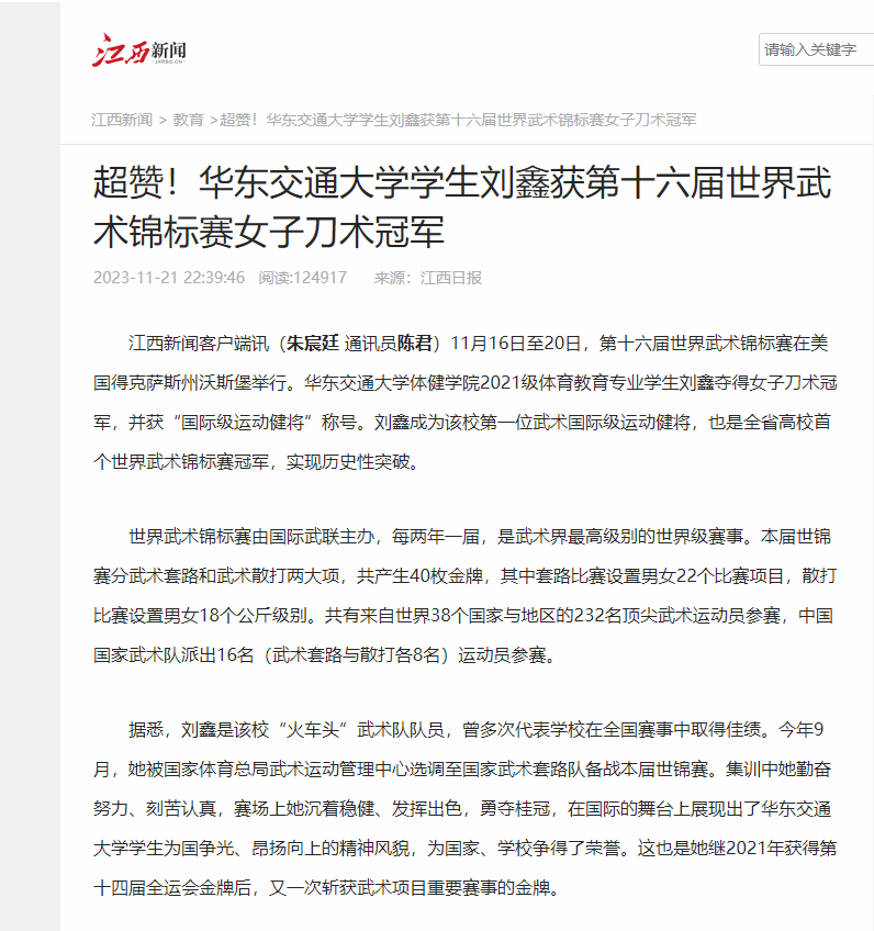 江西新闻客户端讯(朱宸廷 通讯员陈君)11月16日至20日,第十六届世界武术锦标赛在美国得克萨斯州沃斯堡举行。KY开元集团官网入口体健学院2021级体育教育专业学生刘鑫夺得女子刀术冠军,并获“国际级运动健将”称号。刘鑫成为该校第一位武术国际级运动健将,也是全省高校首个世界武术锦标赛冠军,实现历史性突破。
