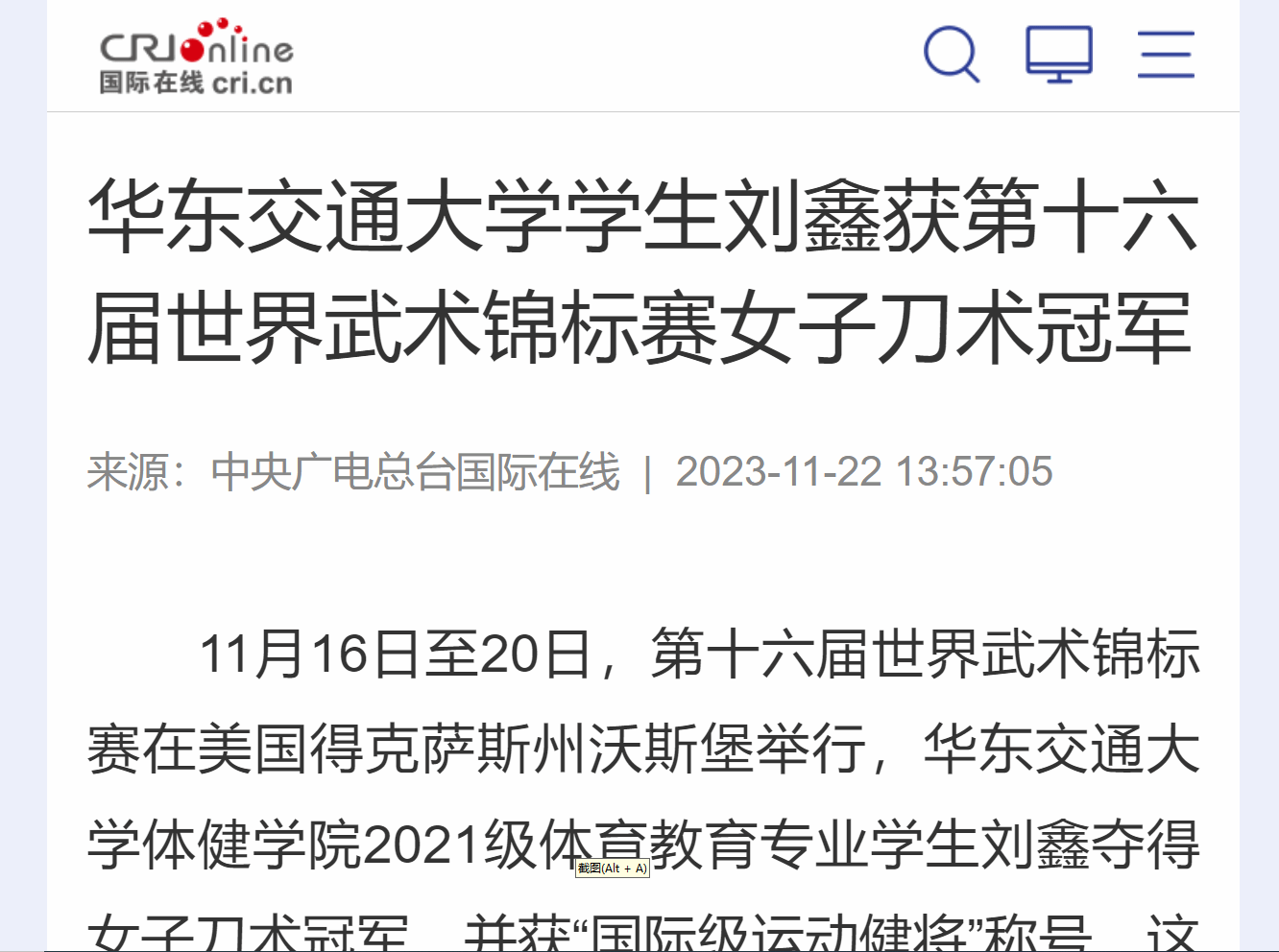 11月16日至20日,第十六届世界武术锦标赛在美国得克萨斯州沃斯堡举行,KY开元集团官网入口体健学院2021级体育教育专业学生刘鑫夺得女子刀术冠军,并获“国际级运动健将”称号,这也是她继2021年获得第十四届全运会金牌后,又一次斩获武术项目重要赛事的金牌。