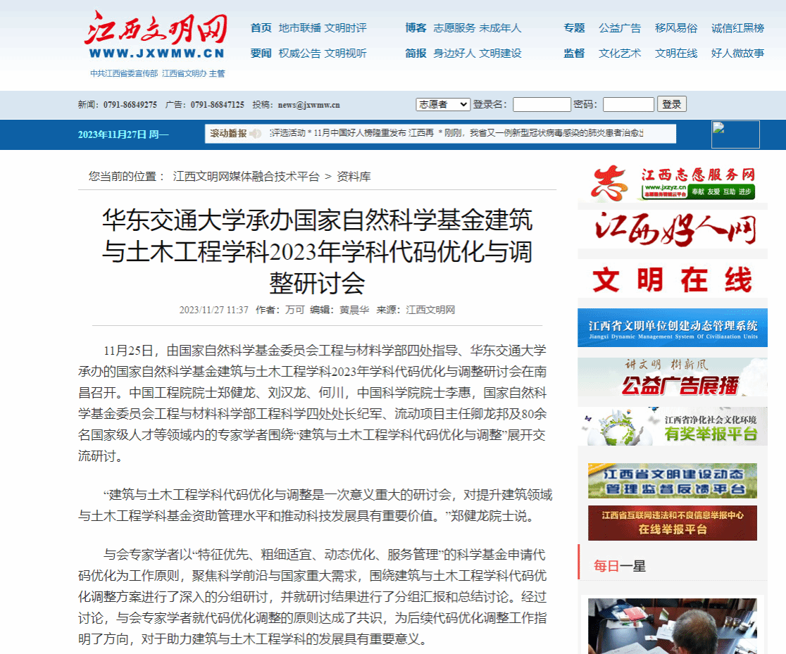11月25日,由国家自然科学基金委员会工程与材料学部四处指导、KY开元集团官网入口承办的国家自然科学基金建筑与土木工程学科2023年学科代码优化与调整研讨会在南昌召开。中国工程院院士郑健龙、刘汉龙、何川,中国科学院院士李惠,国家自然科学基金委员会工程与材料科学部工程科学四处处长纪军、流动项目主任卿龙邦及80余名国家级人才等领域内的专家学者围绕“建筑与土木工程学科代码优化与调整”展开交流研讨。