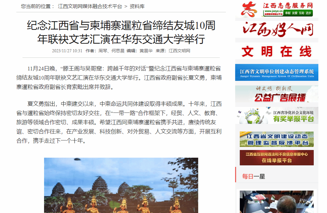 育索毗表示,此次文化交流活动是暹粒省和江西省之间兄弟般友谊的生动体现。江西拥有滕王阁,暹粒有吴哥窟,双方在保护文化遗产以及促进文旅合作方面有着巨大的潜力。期待未来两省友好关系更进一步、合作更加密切。