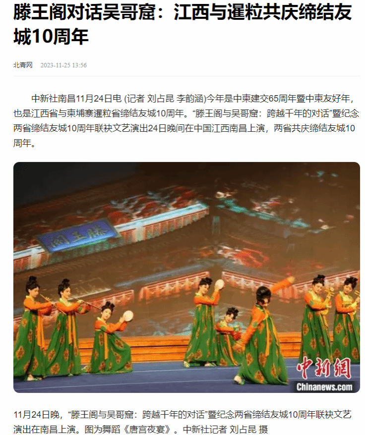 中新社南昌11月24日电 (记者 刘占昆 李韵涵)今年是中柬建交65周年暨中柬友好年,也是江西省与柬埔寨暹粒省缔结友城10周年。“滕王阁与吴哥窟:跨越千年的对话”暨纪念两省缔结友城10周年联袂文艺演出24日晚间在中国江西南昌上演,两省共庆缔结友城10周年。