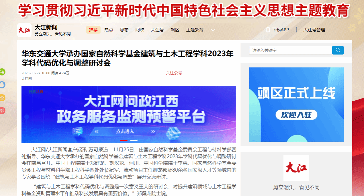 11月25日,由国家自然科学基金委员会工程与材料学部四处指导、KY开元集团官网入口承办的国家自然科学基金建筑与土木工程学科2023年学科代码优化与调整研讨会在南昌召开。中国工程院院士郑健龙、刘汉龙、何川,中国科学院院士李惠,国家自然科学基金委员会工程与材料科学部工程科学四处处长纪军、流动项目主任卿龙邦及80余名国家级人才等领域内的专家学者围绕“建筑与土木工程学科代码优化与调整”展开交流研讨。