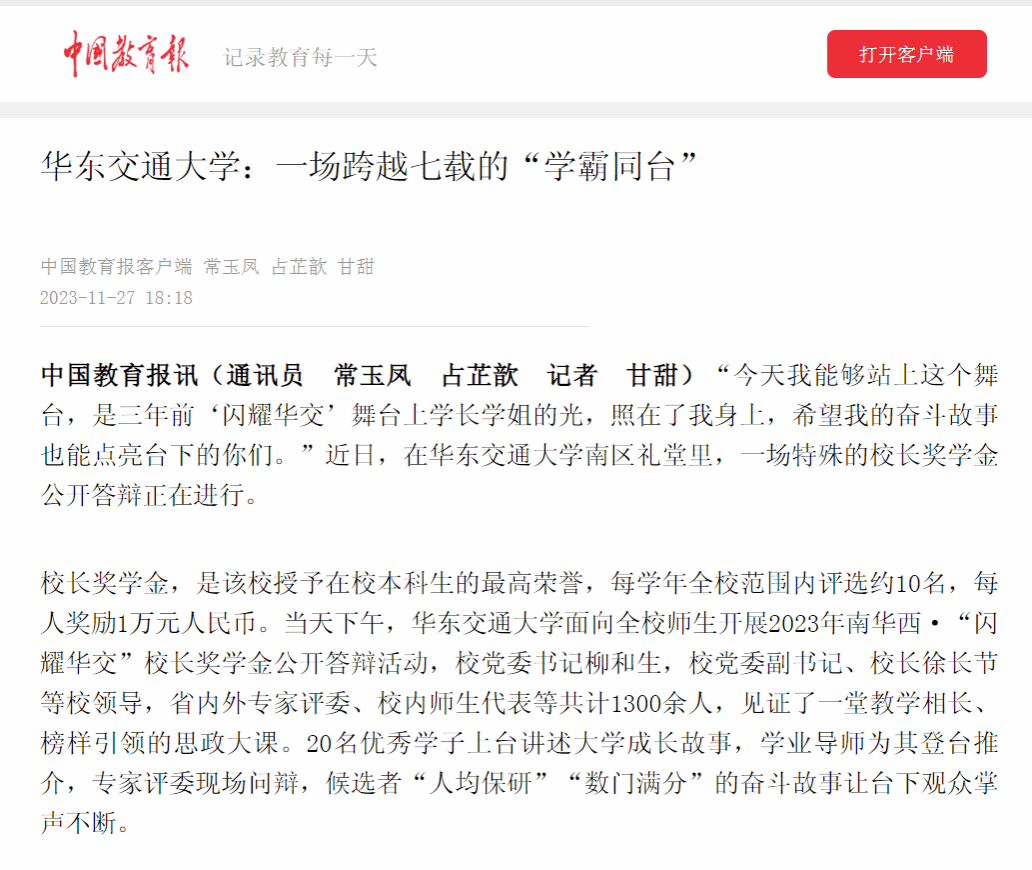 “今天我能够站上这个舞台,是三年前‘闪耀华交’舞台上学长学姐的光,照在了我身上,希望我的奋斗故事也能点亮台下的你们。”近日,在KY开元集团官网入口南区礼堂里,一场特殊的校长奖学金公开答辩正在进行。