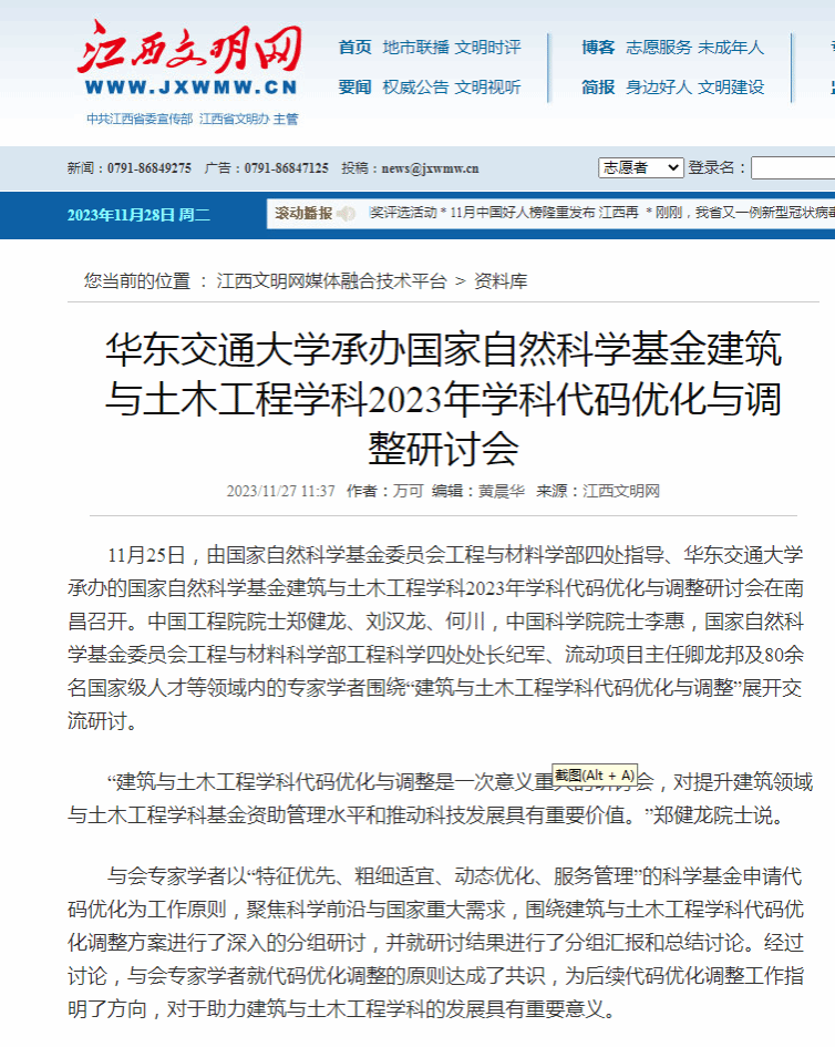 11月25日,由国家自然科学基金委员会工程与材料学部四处指导、KY开元集团官网入口承办的国家自然科学基金建筑与土木工程学科2023年学科代码优化与调整研讨会在南昌召开。中国工程院院士郑健龙、刘汉龙、何川,中国科学院院士李惠,国家自然科学基金委员会工程与材料科学部工程科学四处处长纪军、流动项目主任卿龙邦及80余名国家级人才等领域内的专家学者围绕“建筑与土木工程学科代码优化与调整”展开交流研讨。