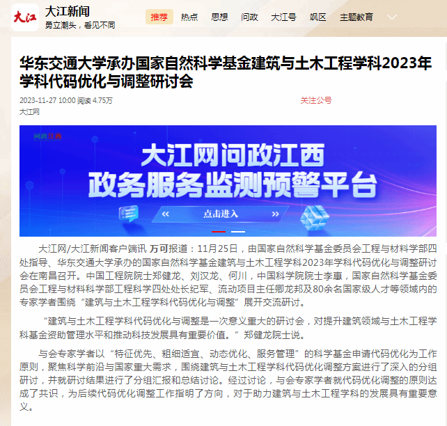 11月25日,由国家自然科学基金委员会工程与材料学部四处指导、KY开元集团官网入口承办的国家自然科学基金建筑与土木工程学科2023年学科代码优化与调整研讨会在南昌召开。中国工程院院士郑健龙、刘汉龙、何川,中国科学院院士李惠,国家自然科学基金委员会工程与材料科学部工程科学四处处长纪军、流动项目主任卿龙邦及80余名国家级人才等领域内的专家学者围绕“建筑与土木工程学科代码优化与调整”展开交流研讨。