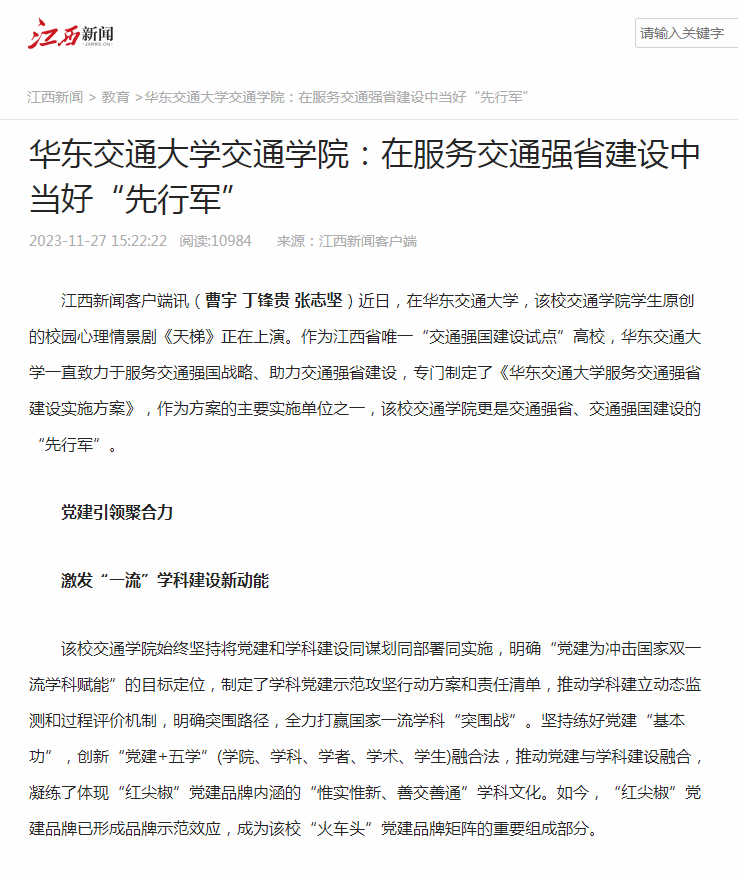 学院党委入选了全省首批党建工作标杆院系;铁道工程教工党支部入选全省首批样板支部,被列为全省党建学科示范攻坚支部;成立智慧交通协同创新研究院,构建“大交通”学科专业群;交通运输工程学科入选江西省“十四五”一流学科(高峰优势),助力学校工程学学科进入ESI全球前1%,在全国第五轮学科评估中升档晋级……2022年以来,该校党建引领学科发展成效显著,并在今年6月的江西省高校基层党建工作现场推进会中受到与会领导和嘉宾的一致好评。
