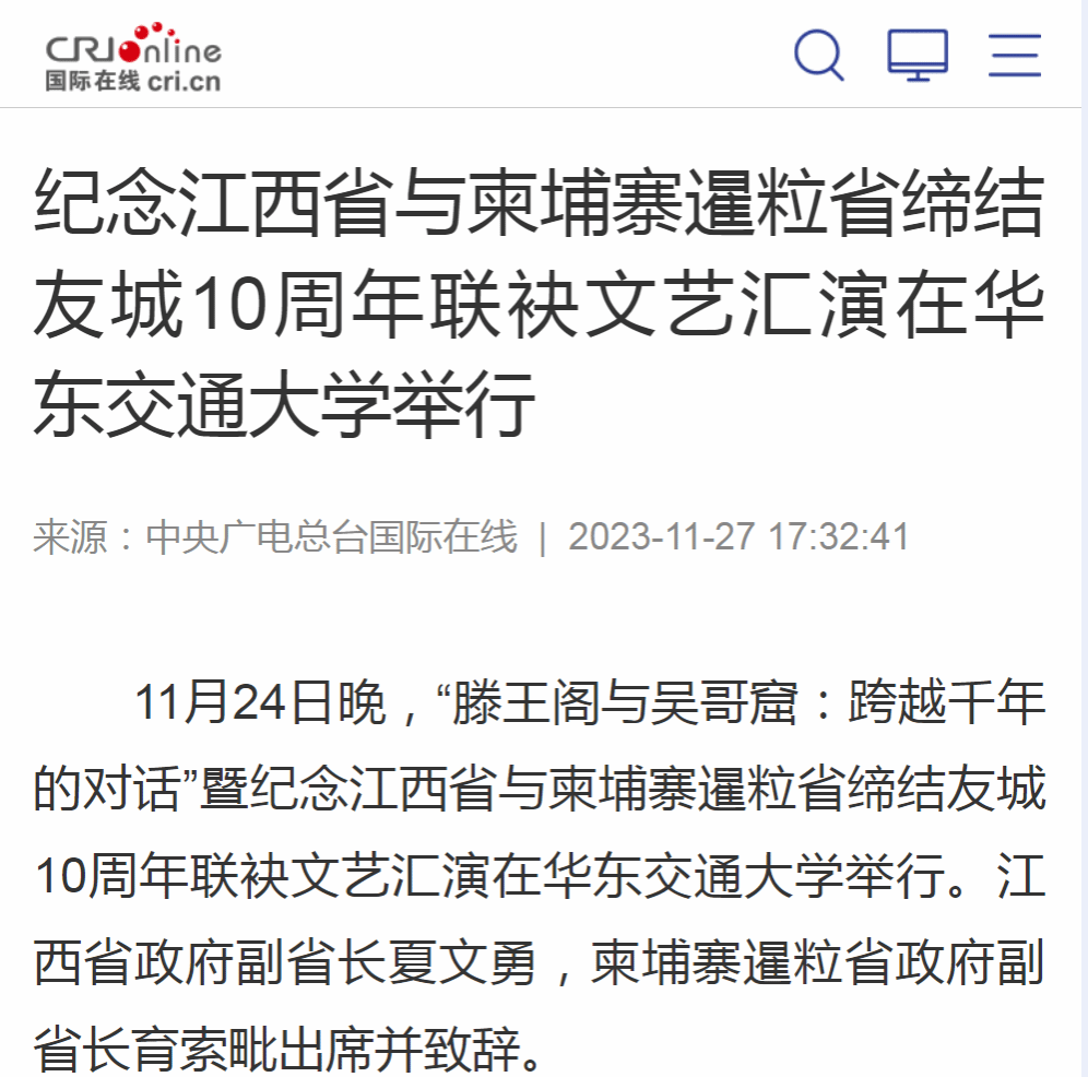 育索毗表示,此次文化交流活动是暹粒省和江西省之间兄弟般友谊的生动体现。江西拥有滕王阁,暹粒有吴哥窟,双方在保护文化遗产以及促进文旅合作方面有着巨大的潜力。期待未来两省友好关系更进一步、合作更加密切。