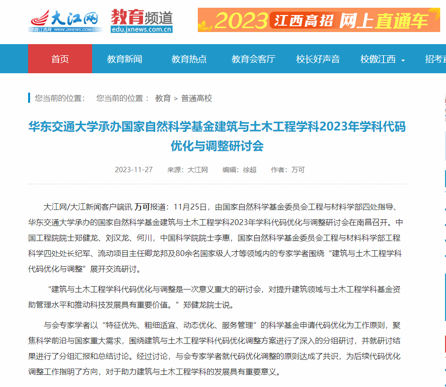 11月25日,由国家自然科学基金委员会工程与材料学部四处指导、KY开元集团官网入口承办的国家自然科学基金建筑与土木工程学科2023年学科代码优化与调整研讨会在南昌召开。中国工程院院士郑健龙、刘汉龙、何川,中国科学院院士李惠,国家自然科学基金委员会工程与材料科学部工程科学四处处长纪军、流动项目主任卿龙邦及80余名国家级人才等领域内的专家学者围绕“建筑与土木工程学科代码优化与调整”展开交流研讨。