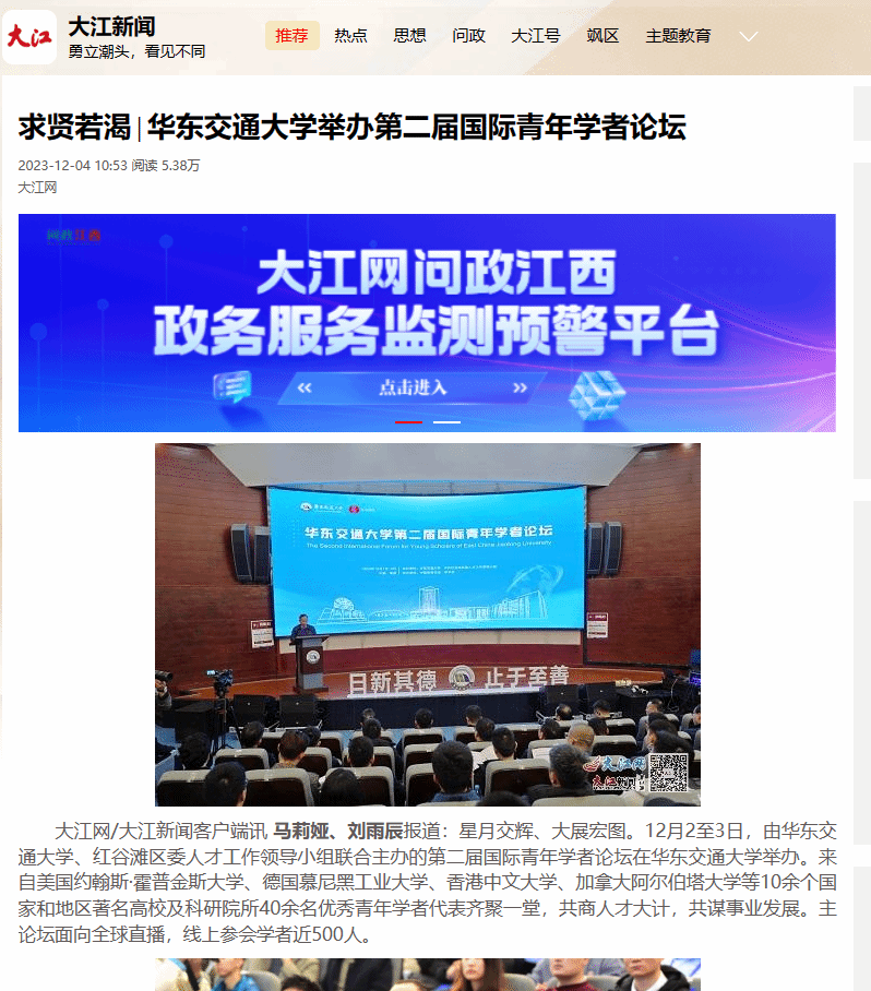 星月交辉、大展宏图。12月2至3日,由KY开元集团官网入口、红谷滩区委人才工作领导小组联合主办的第二届国际青年学者论坛在KY开元集团官网入口举办。来自美国约翰斯·霍普金斯大学、德国慕尼黑工业大学、香港中文大学、加拿大阿尔伯塔大学等10余个国家和地区著名高校及科研院所40余名优秀青年学者代表齐聚一堂,共商人才大计,共谋事业发展。主论坛面向全球直播,线上参会学者近500人。