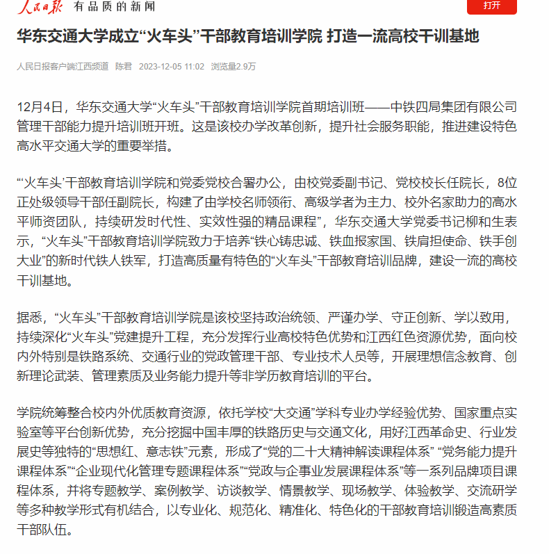据悉,“火车头”干部教育培训学院是该校坚持政治统领、严谨办学、守正创新、学以致用,持续深化“火车头”党建提升工程,充分发挥行业高校特色优势和江西红色资源优势,面向校内外特别是铁路系统、交通行业的党政管理干部、专业技术人员等,开展理想信念教育、创新理论武装、管理素质及业务能力提升等非学历教育培训的平台。