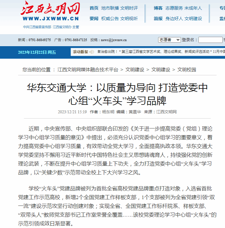 学校“火车头”党建品牌被列为首批全省高校党建品牌重点打造对象,入选省首批党建工作示范高校,新增2个全国党建工作样板支部,1个支部被列为全省党建引领“双一流”建设示范攻坚行动创建对象;实现全省、全国党建工作标杆院系、样板支部、“双带头人”教师党支部书记工作室荣誉全覆盖……该校党委理论学习中心组“火车头”的示范引领成效日渐显著。