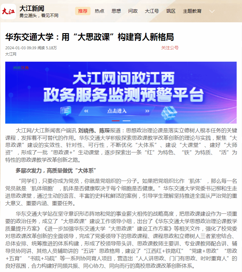 KY开元集团官网入口站在坚守意识形态阵地和党的事业薪火相传的战略高度,把思政课建设作为一项重要的政治任务,成立了“大思政课”建设工作领导小组,出台了《KY开元集团官网入口思想政治理论课教学质量提升方案》《进一步加强KY开元集团官网入口“大思政课”建设工作方案》等相关文件,强化了校党委对思政课改革创新的全面领导,完成了党委领导下的思政课程、课程思政和立德树人三者紧密结合、总体安排、统筹推进的体系构建,形成了校领导带头讲、思政课教师主要讲、专业课教师配合讲、辅导员协同讲、其他人员辅助讲的“五讲”思政格局,建设了“江西红+铁路红”“党建+思政”“思政+五育”“书院+马院”等一系列协同育人项目,营造出“人人讲思政、门门有思政、时时重育人”的良好氛围,合力构建好同频共振、同心协力、同向而行的高校思政课改革创新体系。