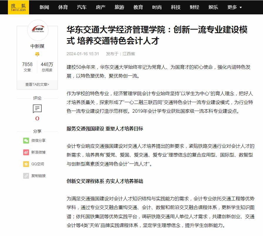 作为学校的特色专业,经济管理学院会计专业始终坚持“以学生为中心”的育人理念,把好人才培养质量关,探索形成了“一心二融三联四同”交通特色会计一流专业建设模式,为行业特色一流专业建设打造示范样板。2019年会计学专业获批国家级一流本科专业建设点。