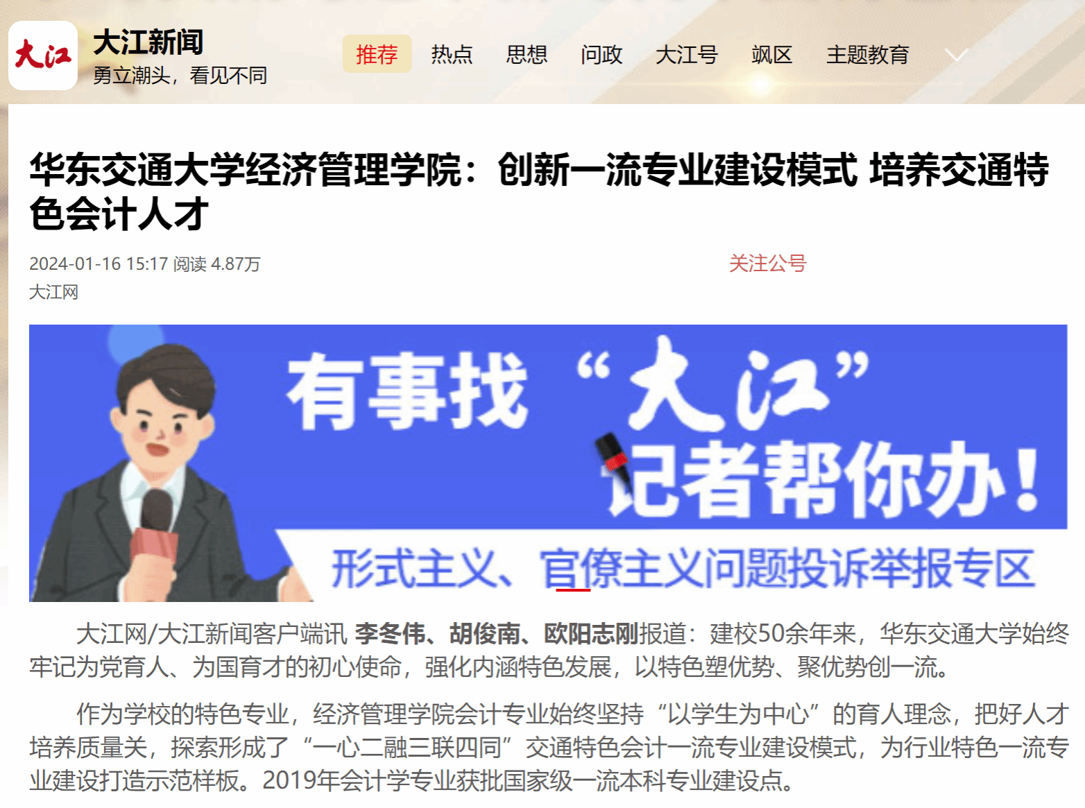 作为学校的特色专业,经济管理学院会计专业始终坚持“以学生为中心”的育人理念,把好人才培养质量关,探索形成了“一心二融三联四同”交通特色会计一流专业建设模式,为行业特色一流专业建设打造示范样板。2019年会计学专业获批国家级一流本科专业建设点。